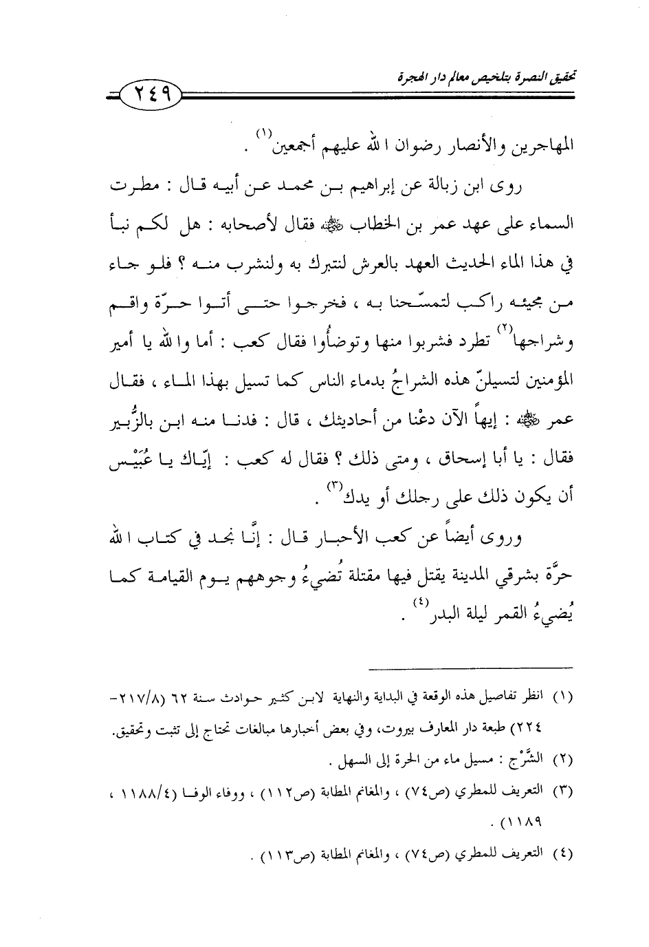 وروى أيضاً عن كعب الأحبار قال: انا نجد في كتاب الله حرة بشرقي المدينة يقتل فيها مقتلة نضيء وجوههم يوم القيامة كما يضيء القمر ليلة البدر (4).