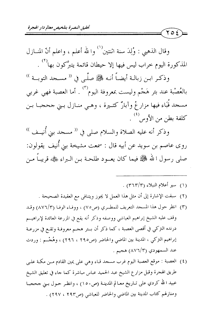 (3) انظر حول هذا المسجد التعريف للمطري (ص75)، ووفاء الوفا (3/ 876) وقد وقف عليه الشيخ ابراهيم العياشي ووصفه وذكر أنه يقع في المزرعة العائدة لابراهيم درنده التركي في أقصى العصبة، كما ذكر أن بئر هجم معروفة وتقع في مزرعة ابراهيم التركي، المدينة بين الماضي والحاضر (ص 295، 296)، وهجم: وردت عند السمهودي (3/ 876) هجيم.