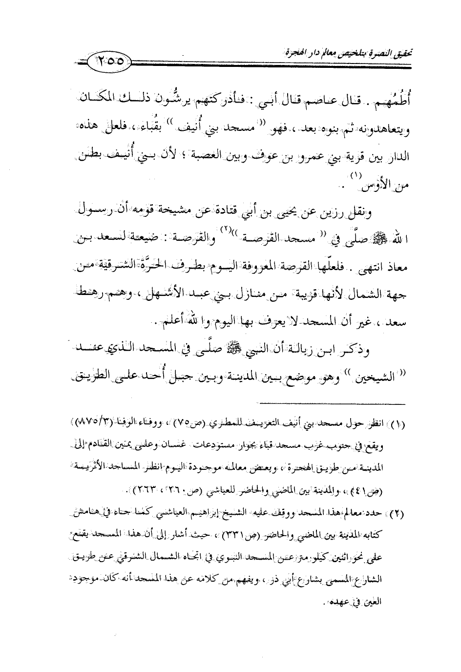 (1) انظر حول مسجد بني أنيف التعريف للمطري (ص75)، ووفاء الوفا (3/ 875 ويقع في جنوب غرب مسجد قباء بجوار مستودعات غسان وعلى يمين القادم إلى المدينة من طريق الهجرة، وبعض معالمه موجودة اليوم انظر المساجد الأثرية (ص 41)، والمدينة بين الماضي والحاضر للعياشي (ص 260، 263).
