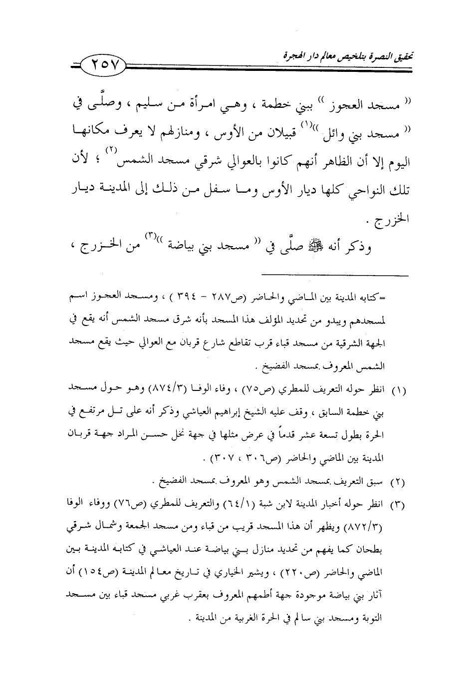 (3) انظر حوله أخبار المدينة لابن شبة (1/ 64) والتعريف للمطري (ص 76) ووفاء الوفا (3/ 872) ويظهر أن هذا المسجد قريب من قباء ومن مسجد الجمعة وشمال شرقي بطحان كما يفهم من تحديد منازل بني بياضة عند العياشي في كتابه المدينة بين الماضي والحاضر (ص 220)، ويشير الخياري في تاريخ معالم المدينة (ص 154) أن آثار بني بياضة موجودة جهة أطمهم المعروف بعقرب غربي مسجد قباء بين مسجد التوبة ومسجد بني سالم في الحرة الغربية من المدينة.