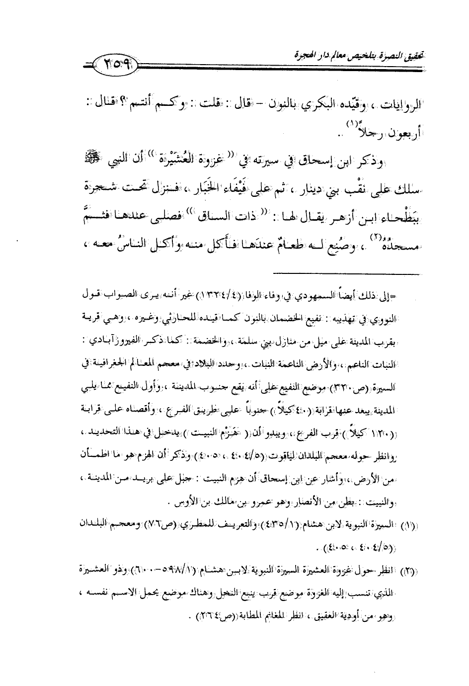 (2) انظر حول غزوة العشيرة السيرة النبوية لابن هشام (1/ 598 - 600) وذو العشيرة الذي تنسب اليه الغزوة موضع قرب ينبع النخل وهناك موضع يحمل الاسم نفسه، وهو من أودية العقيق، انظر المغانم المطابة (ص 264).