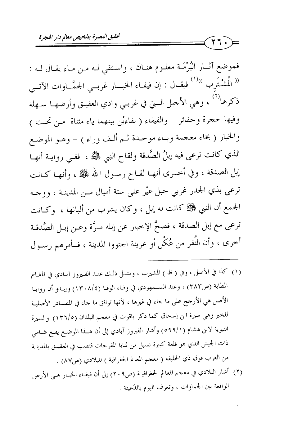 (1) كذا في الأصل، وفي (ظ) المشيرب، ومثل ذلك عند الفيروز آبادي في المغانم المطابة (ص 383)، وعند السمهودي في وفاء الوفا (4/ 1308) ويبدو أن رواية الأصل هي الأرجح على ماجاء في غيرها، لأنها توافق ما جاء في المصادر الأصلية للخبر وهي سيرة ابن اسحاق كما ذكر ياقوت في معجم البلدان (5/ 136) والسيرة النبوية لابن هشام (1/ 599) وأشار الفيروز آبادي إلى أن هذا الموضع يقع شامي ذات الجيش الذي هو قلعة كبيرة تسيل من ثنايل المفرحات فتصب في العقيق بالمدينة من الغرب فوق ذي الحليفة (معجم المعالم الجغرافية) للبلادي (ص 87).