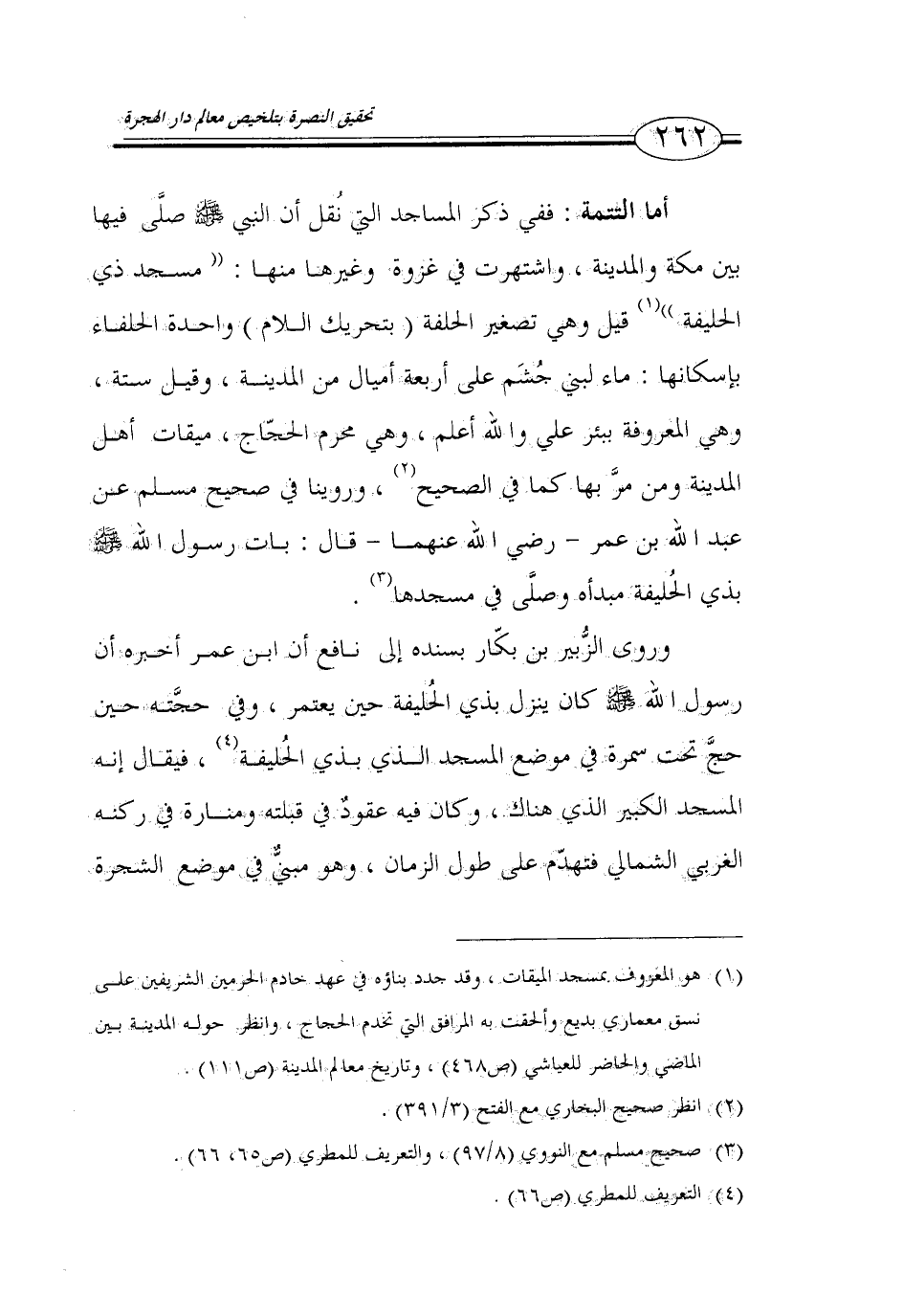 أما التتمة: ففي ذكر المساجد التي نقل أن النبي صلى الله عليه وسلم صلى فيها بين مكة والمدينة، واشتهرت في غزوة وغيرها منها: (مسجد ذي الحليفة) (1) قيل وهي تصغير الحلفة (بتحريك اللام) واحدة الحلفاء باسكانها: ماء لبني جشم على أربعة أميال من المدينة، وقيل ستة، وهي المعروفة ببئر على والله أعلم، وهي محرم الحجاج، ميقات أهل المدينة ومن مر بها كما في الصحيح (2)، وروينا في صحيح مسلم عن عبد الله بن عمر - رضي الله عنهما - قال: بات رسول الله صلى الله عليه وسلم بذي الحليفة مبدأه وصلى في مسجدها (3).