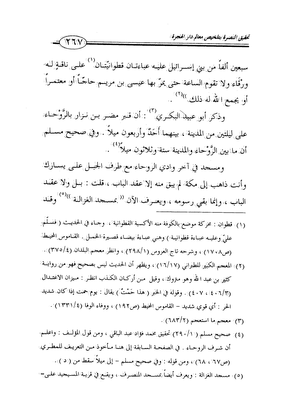 (4) صحيح مسلم (1/ 290) تحقيق محمد فؤاد عبد الباقي، ومن قول المؤلف: واعلم أن شرف الروحاء. في الصفحة السابقة إلى هنا مأخوذ من التعريف للمطري (ص 67، 68)، ومن قوله: وفي صحيح مسلم - إلى ميلاً سقط من (د).