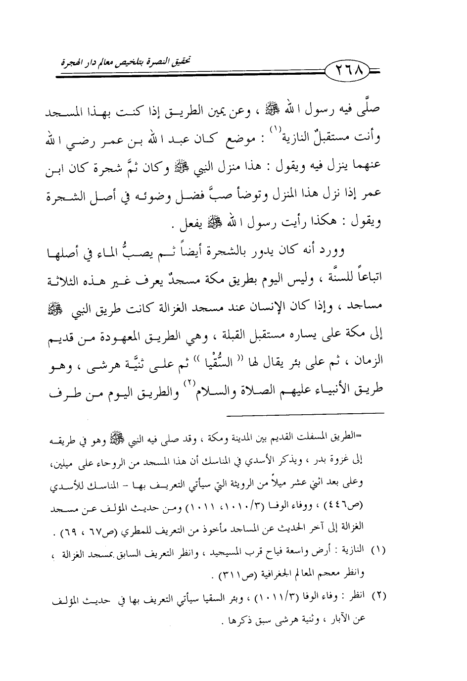 = الطريق المسفلت القديم بين المدينة ومكة، وقد صلى فيه النبي صلى الله عليه وسلم وهو في طريقه إلى غزوة بدر، ويذكر الأسدي في المناسك أن هذا المسجد من الروحاء على ميلين، وعلى بعد اثني عشر ميلاً من الرويثة التي سيأتي التعريف بها - المناسك للأسدي (ص 446)، ووفاء الوفا (3/ 1010، 1011) ومن حديث المؤلف عن مسجد الغزالة إلى آخر الحديث عن المساجد مأخوذ من التعريف للمطري (ص 67، 69).