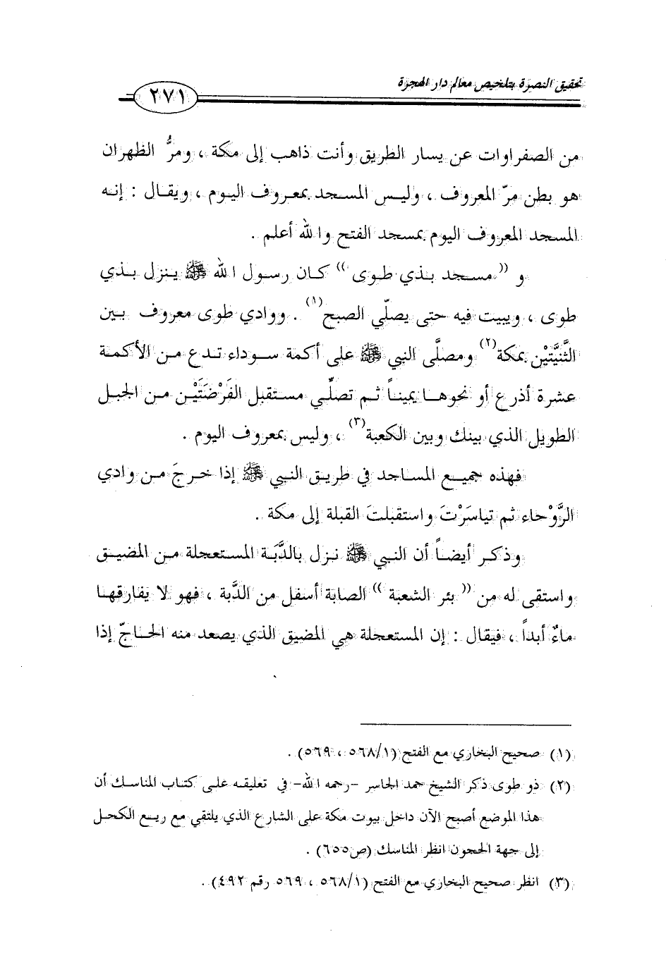 (2) ذو طوى ذكر الشيخ حمد الجاسر - رحمه الله - في تعليقه على كتاب المناسك أن هذا الموضع أصبح الآن داخل بيوت مكة على الشارع الذي يلتقي مع ريع الكحل إلى جهة الحجون انظر المناسك (ص 655).