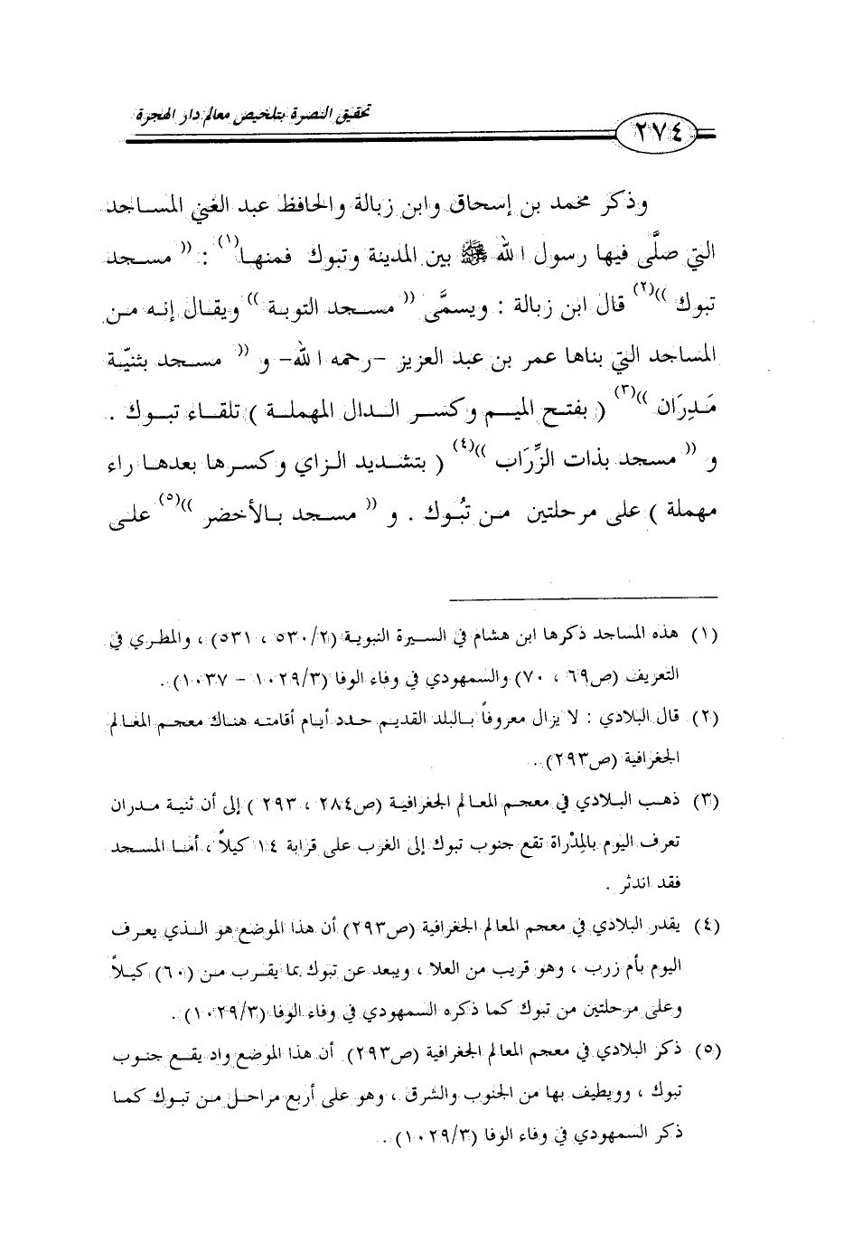 (3) ذهب البلادي في معجم المعالم الجغرافية (ص 284، 293) إلى أن ثنية مدران تعرف اليوم بالمدارة تقع جنوب تبوك إلى الغرب على قرابة 14 كيلاً، أما المسجد فقد اندثر.