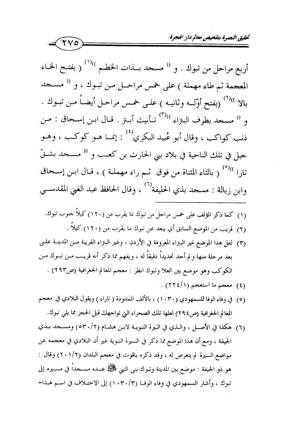 (3) لعل هذا الموضع غير البتراء المعروفة في الأردن، وغير البتراء القريبة من المدينة على بعد مرحلة منها ولم أجد تحديداً دقيقاً له، ويفهم مما ذكر أنه قريب من تبوك من الكوكب وهو موضع بين العلا وتبوك انظر: معجم المعالم الجغرافية (ص 293).