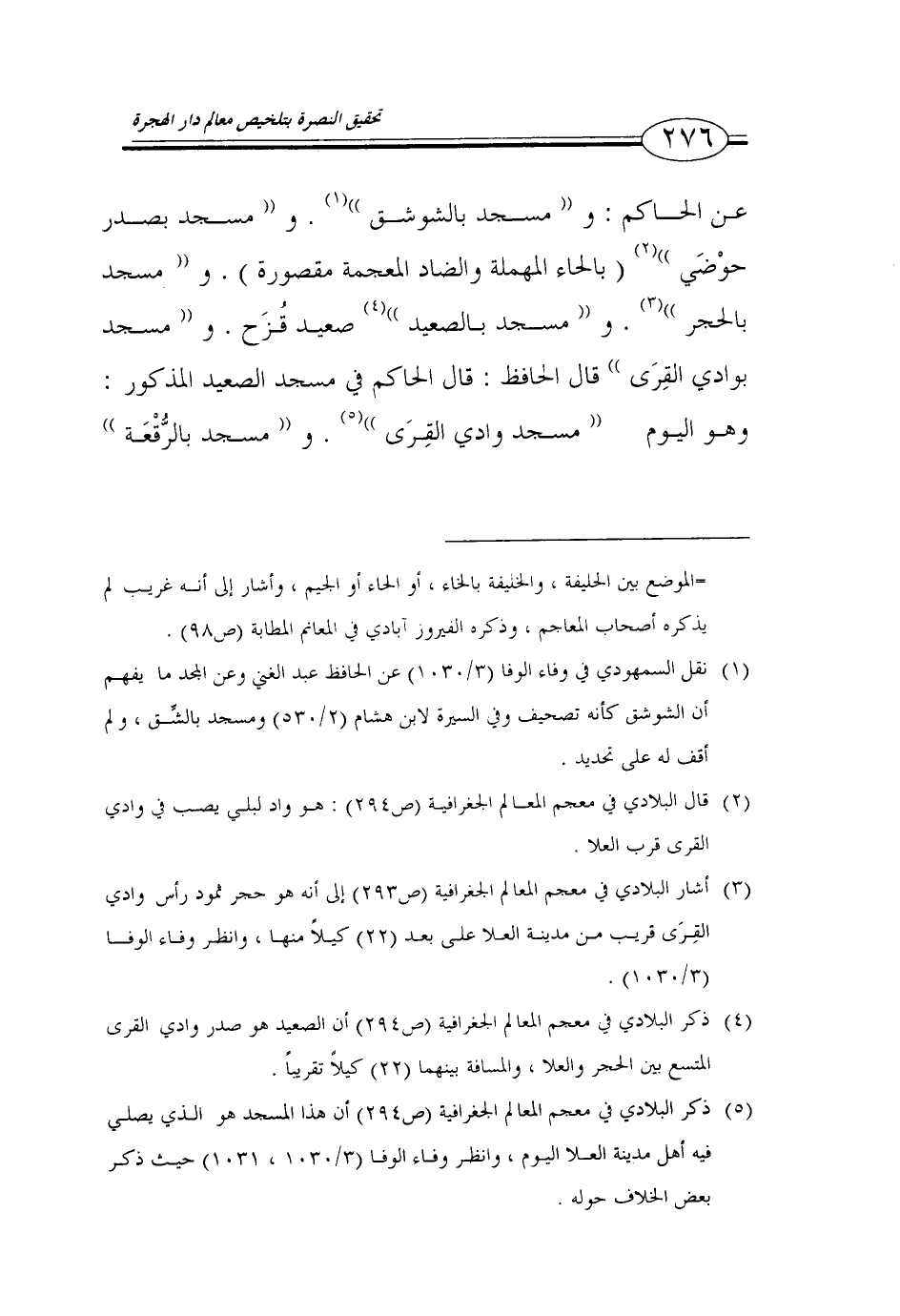 (5) ذكر البلادي في معجم المعالم الجغرافية (ص294) ان هذا المسجد هو الذي يصلي فيه اهل مدينة العلا اليوم، وانظر وفاء الوفا (1030/ 3، 1031) حيث ذكر بعض الخلاف حوله.