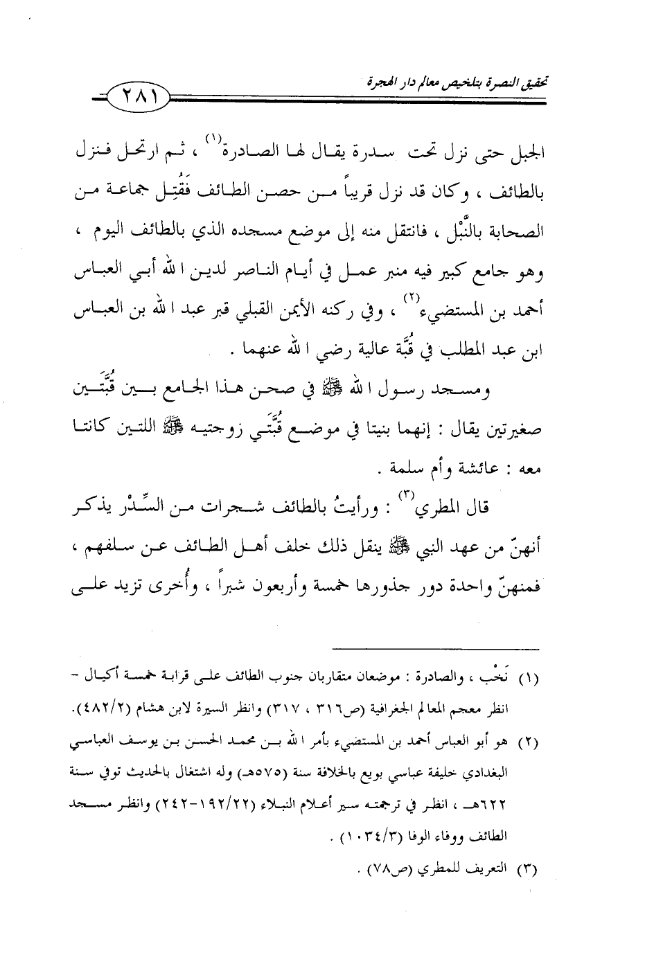 الجبل حتى نزل تحت سدرة يقال لها الصادرة (1)، ثم ارتجل فنزل بالطائف، وكان قد نزل قريبا من حصن الطائف فقتل جماعة من الصحابة بالنبل، فانتقل منه إلى موضع مسجده الذي بالطائف اليوم، وهو جامع كبير فيه منبر عمل في ايام الناصر لدين الله أبي العباس أحمد بن المستضيء (2)، وفي ركنه الايمن القبلي قبر عبد الله بن العباس ابن عبد المطلب في قبة عالية رضي الله عنهما.