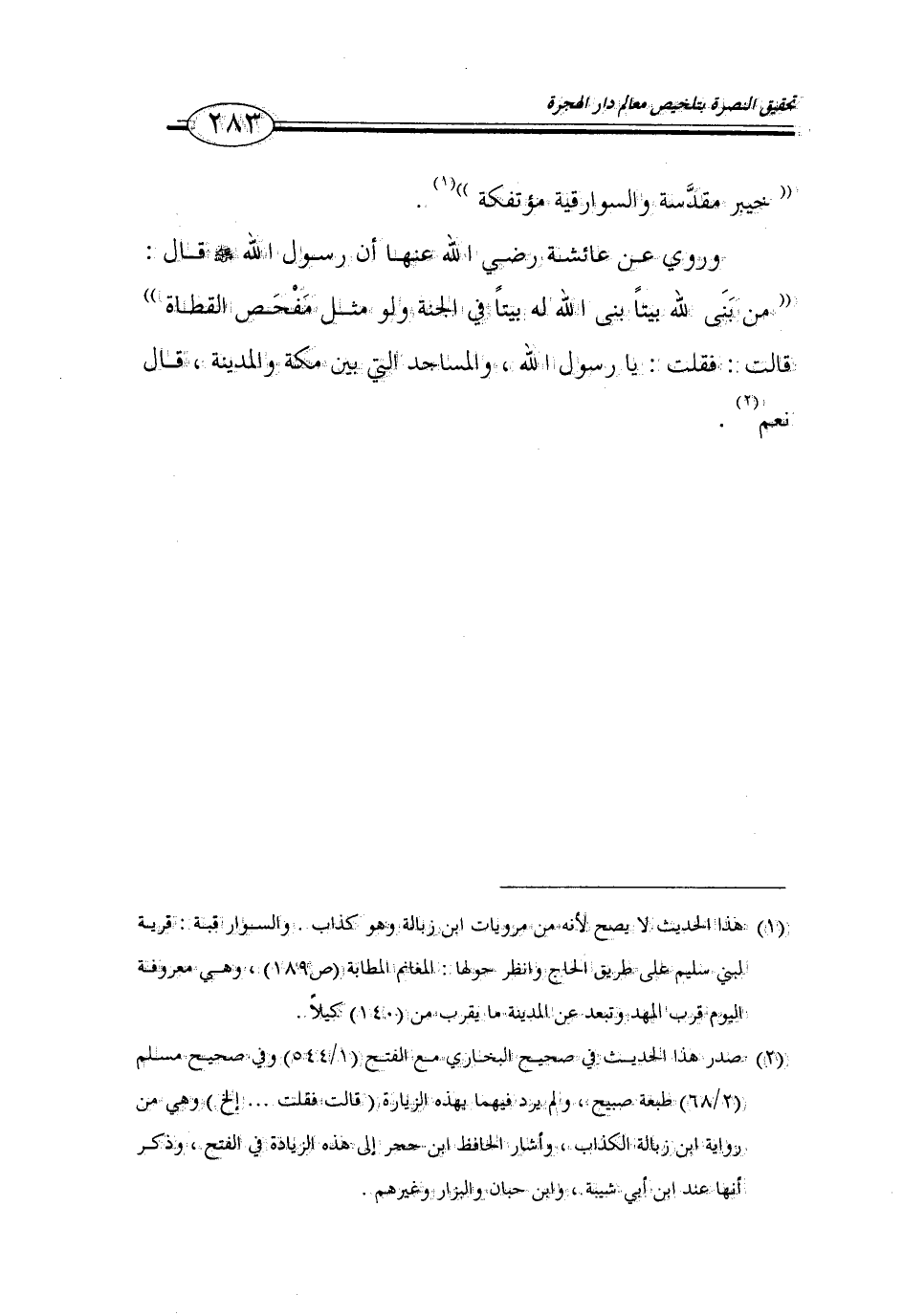 (1) هذا الحديث لا يصح لانه من مرويات ابن زبالة وهو كذاب. والسوار قبة: قرية لبني سليم على طريق الحاج وانظر حولها: المغانم المطابة (ص189)، وهي معروفة اليوم قرب المهد وتبعد عن المدينة ما يقرب من (140) كيلا.