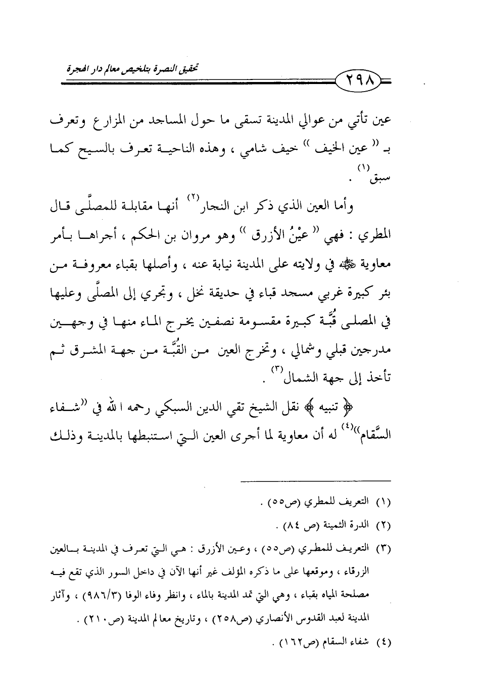 (3) التعريف للمطري (ص 55)، وعين الأزرق: هي التي تعرف في المدينة بالعين الزرقاء، وموقعها على ما ذكره المؤلف غير أنها الآن في داخل السور الذي تقع فيه مصلحة المياه بقباء، وهي التي تمد المدينة بالماء، وانظر وفاء الوفا (3/ 986)، وآثار المدينة لعبد القدوس الأنصاري (ص 258)، وتاريخ معالم المدينة (ص 210).