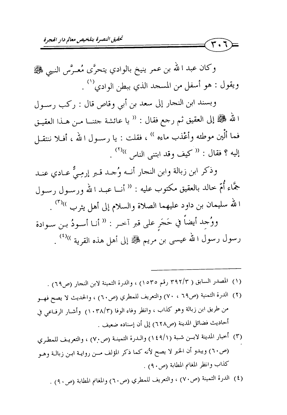 (3) أخبار المدينة لابن شبة (1/ 149) والدرة الثمينة (ص 70)، والتعريف للمطري (ص 60) ويبدو أن الخبر لا يصح لأنه كما ذكر المؤلف من رواية ابن زبالة وهو كذاب وانظر المغانم المطابة (ص 90).