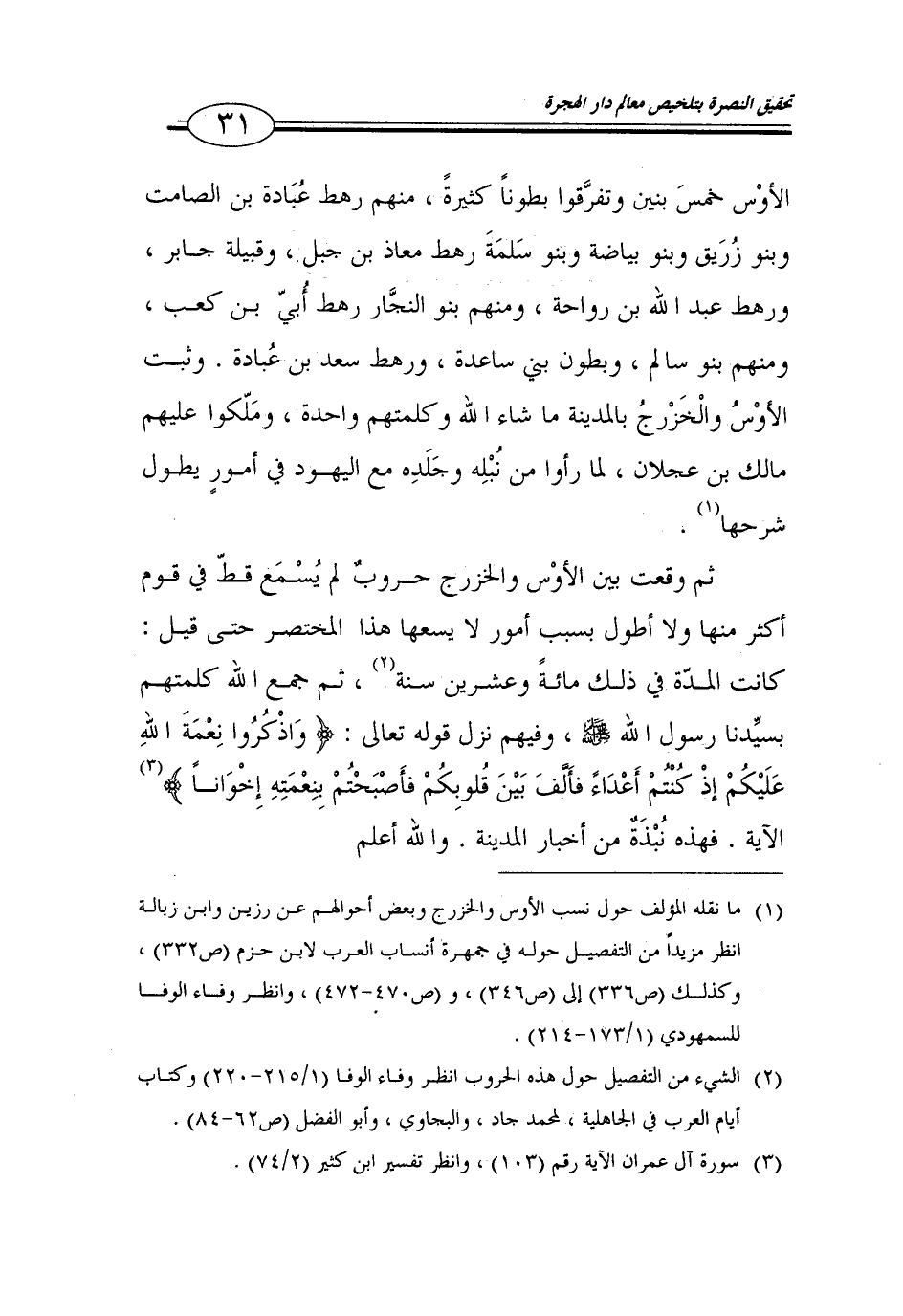 (1) ما نقله المؤلف حول نسب الأوس والخزرج وبعض أحوالهم عن رزين وابن زبالة انظر مزيداً من التفصيل حوله في جمهرة أنساب العرب لابن حزم (ص332)، وكذلك (ص336) إلى (ص346)، و (ص470 - 472)، وانظر وفاء والوفا للسمهودي (1/ 173 - 214).