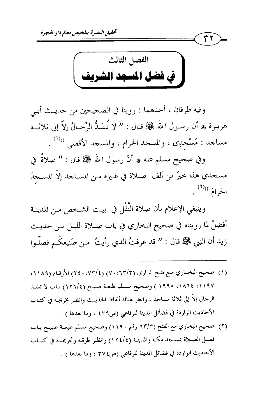 (1) صحيح البخاري مع فتح الباري (3/ 63، 70) (4/ 73، 240) الأرقام (1189، 1197، 1864، 1995) وصحيح مسلم طبعة صبيح (4/ 126) باب لا تشد الرحال الا إلى ثلاثة مساجد، وانظر هناك ألفاظ الحديث وانظر تخريجه في كتاب الأحاديث الواردة في فضائل المدينة للرفاعي (ص 439، وما بعدها).