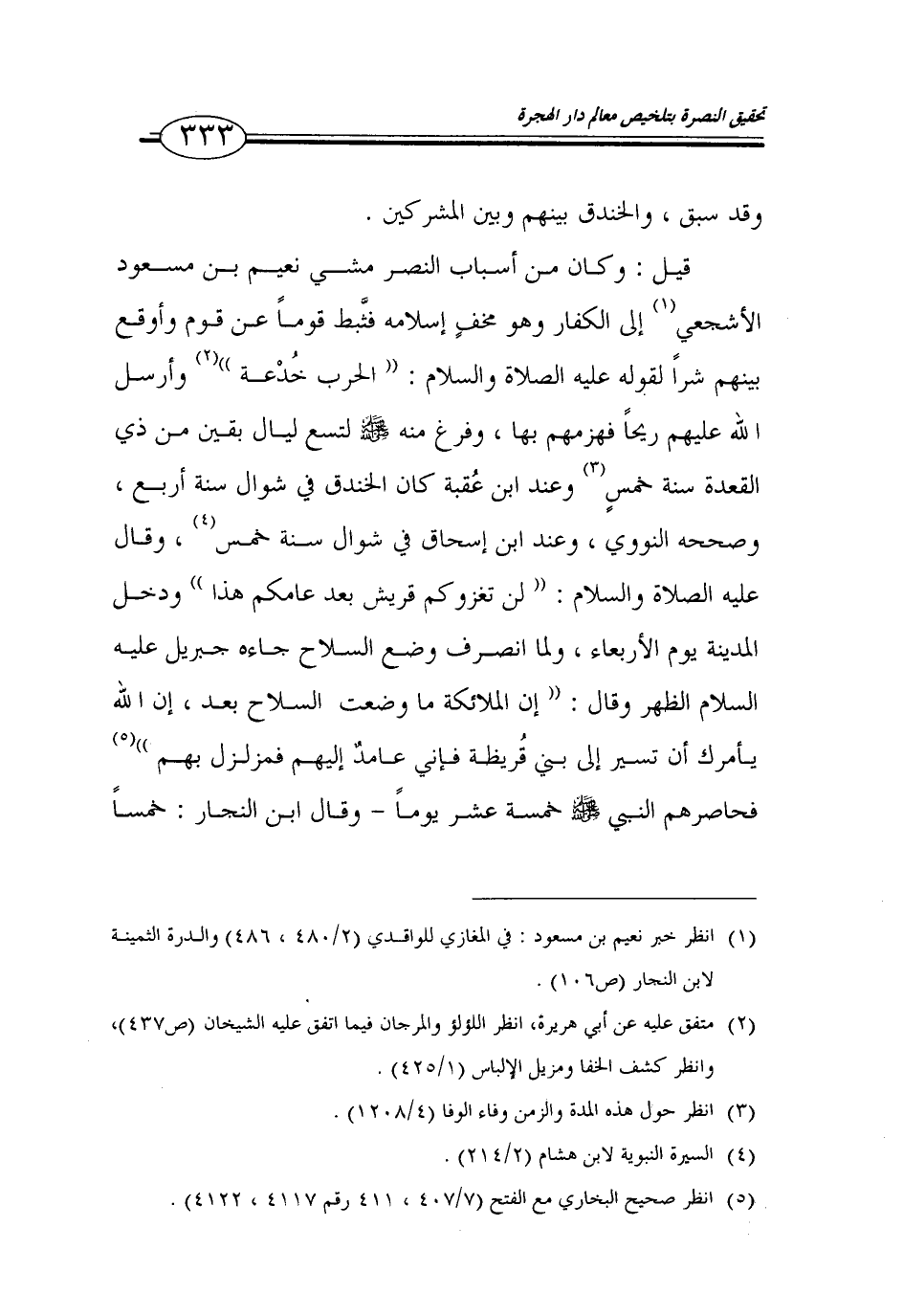 قيل: وكان من أسباب النصر مشي نعيم بن مسعود الأشجعي (1) إلى الكفار وهو مخف اسلامه فثبط قوماً عن قوم وأوقع بينهم شراً لقوله عليه الصلاة والسلام: (الحرب خدعة) (2) وأرسل الله عليهم ريحاً فهزمهم بها، وفرغ منه صلى الله عليه وسلم لتسع بقين من ذي القعدة سنة خمس (3) وعند ابن عقبة كان الخندق في شوال سنة أربع، وصححه النووي، وعند ابن اسحاق في شوال سنة خمس (4)، وقال عليه الصلاة والسلام: (لن تغزوكم قريش بعد عامكم هذا) ودخل المدينة يوم الأربعاء، ولما انصرف وضع السلاح جاءه جبريل عليه السلام الظهر وقال: (ان الملائكة ما وضعت السلاح بعد، ان الله يأمرك أن تسير إلى بني قريظة فاني عامد اليهم فمزلزل بهم) (5) فحاصرهم النبي صلى الله عليه وسلم خمسة عشر يوماً - وقال ابن النجار: خمساً…