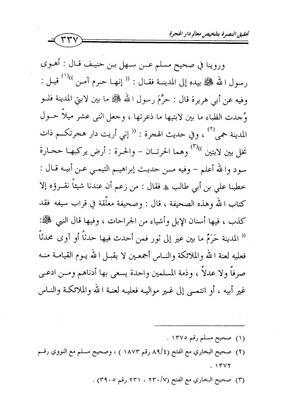 337…وروينا في صحيح مسلم عن سهل بن حنيف قال: أهوى رسول الله صلى الله عليه وسلم بيده إلى المدينة فقال: (انها حرم آمن) (1) قيل: وفيه عن أبي هريرة قال: حرم رسول الله صلى الله عليه وسلم ما بين لابتي المدينة فلو وجدت الظباء ما بين لابتيها ما ذعرتها، وجعل اثنى عشر ميلاً حول المدينة حمى (2)، وفي حديث الهجرة: (اني أريت دار هجرتكم ذات نخل بين لابتين) (3) وهما الحرتان - والحرة: أرض يركبها حجارة سود والله أعلم - وفيه من حديث ابراهيم التيمي عن أبيه قال: خطبنا علي بن أبي طالب رضي الله عنه فقال: من زعم أن عندنا شيئاً نقرؤه الا كتاب الله وهذه الصحيفة، قال: وصحيفة معلقة في قراب سيفه فقد كذب، فيها أسنان الابل وأشياء من الجراحات، وفيها قال النبي صلى الله عليه وسلم: (المدينة حرم ما بين عير إلى ثور فمن أحدث فيها حدثاً أو آوى محدثاً فعليه لعنة الله والملائكة والناس أجمعين لا يقبل الله يوم القيامة منه صرفاً ولا عدلاً، وذمة المسلمين واحدة يسعى بها أدناهم ومن ادعى غير أبيه، أو انتمى إلى غير مواليه فعليه لعنة الله والملائكة والناس…