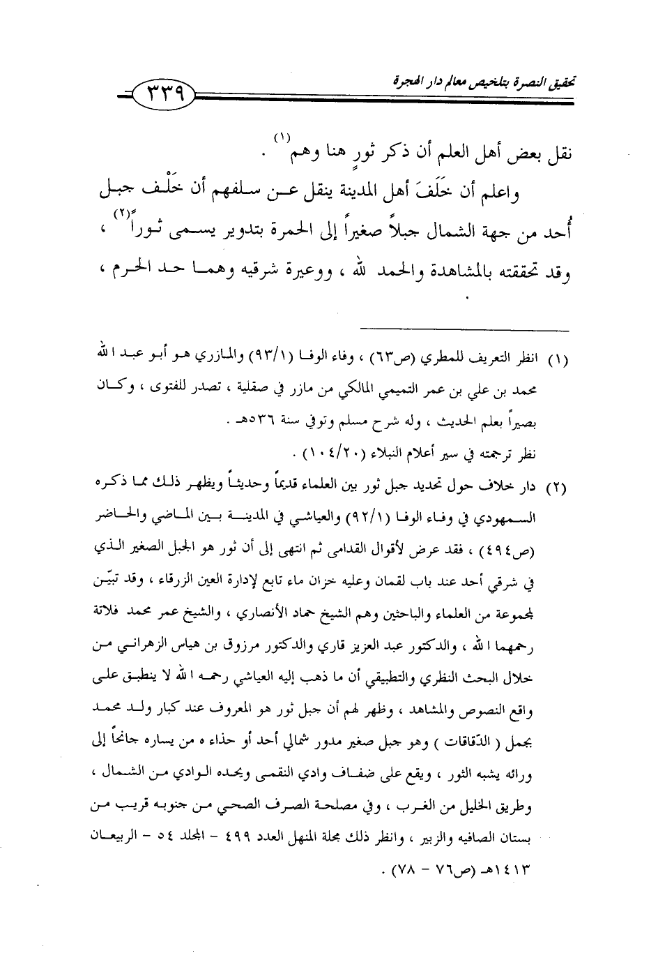 واعلم أن خلف أهل المدينة ينقل عن سلفهم أن خلف جبل أحد من جهة الشمال جبلاً صغيراً إلى الحمرة بتدوير يسمى ثوراً (2)، وقد تحققته بالمشاهدة والحمد لله، ووعيرة شرقية وهما حد الحرم،…