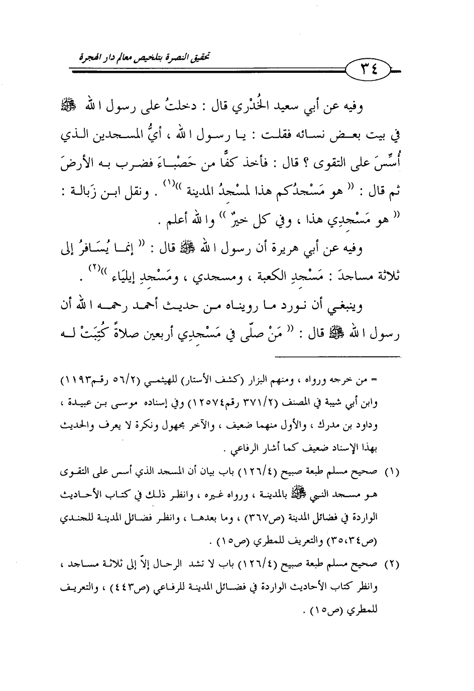 (2) صحيح مسلم طبعة صبيح (4/ 126) باب لا تشد الرحال الا إلى ثلاثة مساجد، وانظر كتاب الأحاديث الواردة في فضائل المدينة للرفاعي (ص 443)، والتعريف للمطري (ص 15).