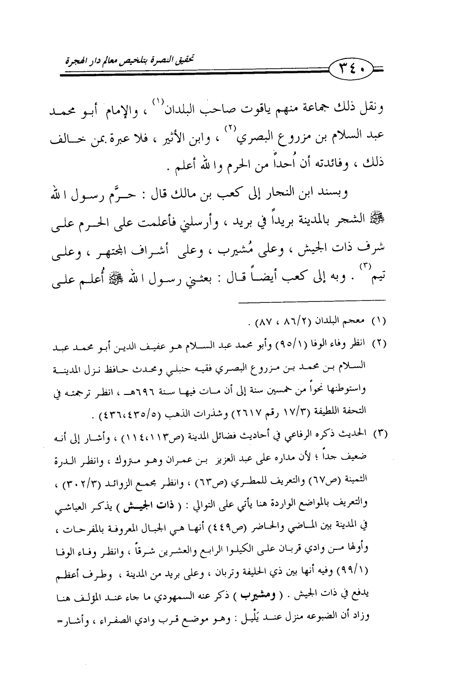 340…ونقل ذلك جماعة منهم ياقوت صاحب البلدان (1)، والإمام أبو محمد عبد السلام بن مزروع البصري (2)، وابن الأثير، فلا عبرة بمن خالف ذلك، وفائدته أن أحداً من الحرم والله أعلم.