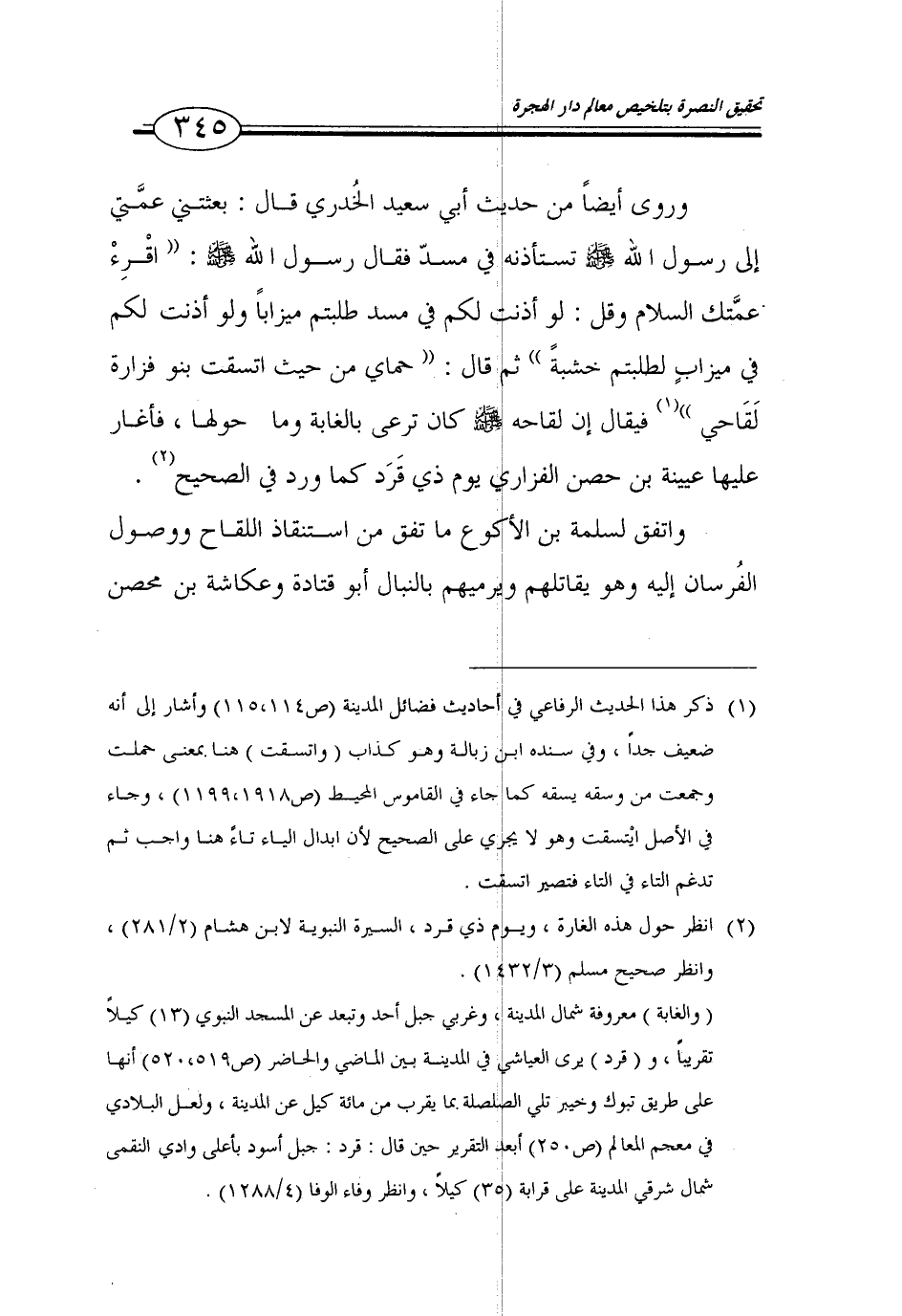 345…وروى أيضاً من حديث أبي سعيد الخدري قال: بعثتني عمتي إلى رسول الله صلى الله عليه وسلم تستأذنه في مسد فقال رسول الله صلى الله عليه وسلم: (اقرء عمتك السلام وقل: لو أذنت لكم في مسد طلبتم ميزاباً ولو أذنت لكم في ميزاب لطلبتم خشبة) ثم قال: (حماي من حيث اتسقت بنو فزارة لقاحي) (1) فيقال ان لقاحه صلى الله عليه وسلم كان ترعى بالغابة وما حولها، فأغار عليها عيينة بن حصن الفزاري يوم ذي قرد كما ورد في الصحيح (2).