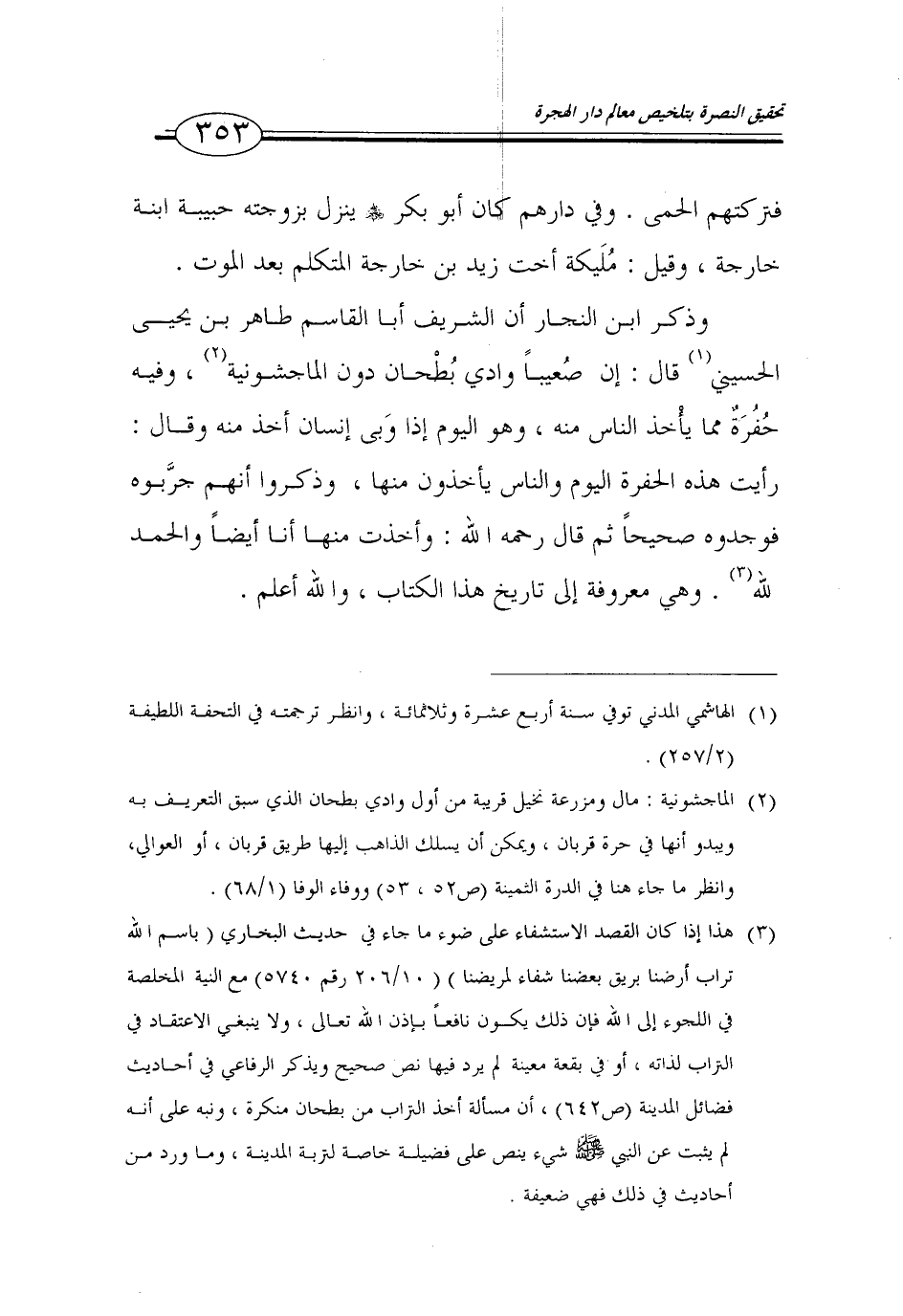 (3) هذا اذا كان القصد الاستشفاء على ضوء ما جاء في حديث البخاري (باسم الله تراب أرضنا بريق بعضنا شفاء لمريضنا) (10/ 206 رقم 5740) مع النية المخلصة في اللجوء إلى الله فان ذلك يكون نافعاً باذن الله تعالى، ولا ينبغي الاعتقاد في التراب لذاته، أو في بقعة معينة لم يرد فيها نص صحيح ويذكر الرفاعي في أحاديث فضائل المدينة (ص 642)، أن مسألة أخذ التراب من بطحان منكرة، ونبه على أنه لم يثبت عن النبي صلى الله عليه وسلم شيء ينص على فضيلة خاصة لتربة المدينة، وما ورد من أحاديث في ذلك فهي ضعيفة.