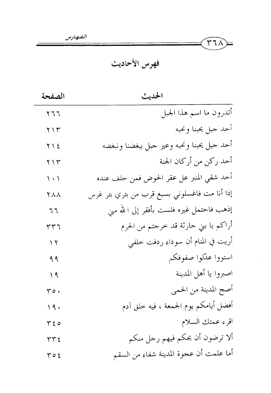أتدرون ما اسم هذا الجبل 266 أحد جبل يحبنا ونحبه 213 أحد جبل يحبنا ونحبه وعير جبل ببغضنا ونبغضه 214 أحد ركن من أركان الجنة 213 أحد شقي المنبر عل عقر الحوض فمن حلف عنده 101 اذا أنا مت فاغسلوني بسبع قرب من بئري بئر غرس 288 اذهب فاحتمل غيره فلست بأفقر إلى الله مني 66 أراكم يا بني حارثة قد خرجتم من الحرم 336 أريت في المنام أن سوداء ردفت خلفي 12 استووا عدلوا صفوفكم 99 اصبروا يا أهل المدينة 19 أصح المدينة من الحمى 350 أفضل أيامكم يوم الجمعة، فيه خلق آدم 190 اقرء عمتك السلام 345 ألا ترضون أن يحكم فيهم رجل منكم 334 أما علمت أن عجوة المدينة شفاء من السقم 354…