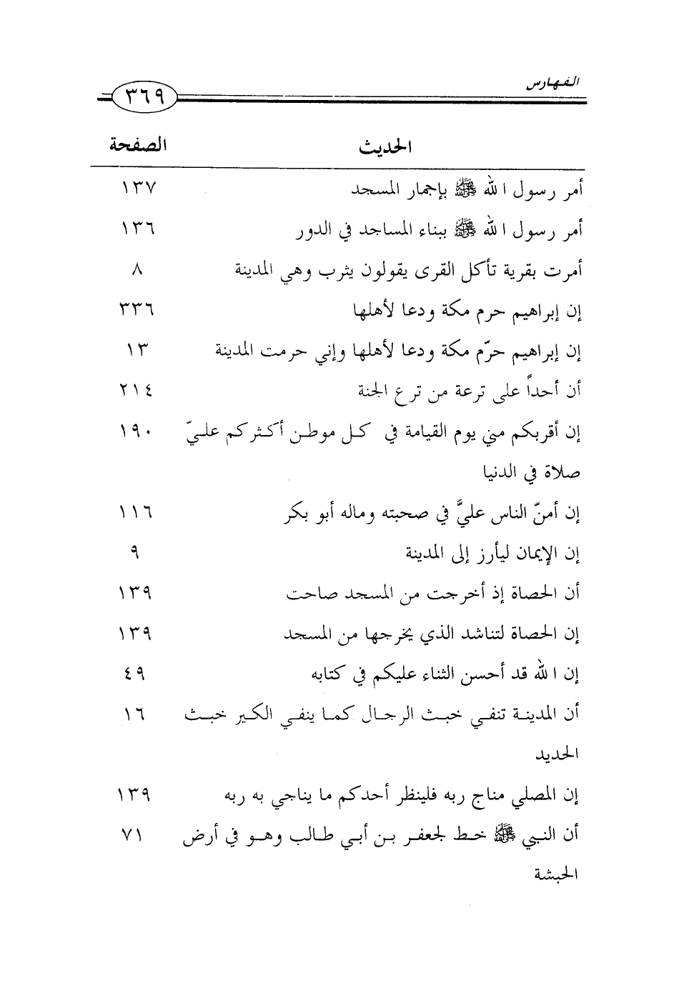 أمر رسول الله صلى الله عليه وسلم باجمار المسجد 137 أمر رسول الله صلى الله عليه وسلم ببناء المساجد في الدور 136 أمرت بقرية تأكل القرى يقولون يثرب وهي المدينة 8 ان ابراهيم حرم مكة ودعا لأهلها 336 ان ابراهيم حرم مكة ودعا لأهلها واني حرمت المدينة 13 أن أحداً على ترعة من ترع الجنة 214 ان أقربكم مني يوم القيامة في كل موطن أكثركم علي 190 صلاة في الدنيا ان أمن الناس علي في صحبته وماله أبو بكر 116 ان الايمان ليأرز إلى المدينة 9 أن الحصاة اذ أخرجت من المسجد صاحت 139 ان الحصاة لتناشد الذي يخرجها من المسجد 139 ان الله قد أحسن الثناء عيلكم في كتابه 49 أن المدينة تنفي خبث الرجال كما ينفي الكير خبث 16 الحديد ان المصلي مناج ربه فلينظر أحدكم ما يناجي به ربه 139 أن النبي صلى الله عليه وسلم خط لجعفر بن أبي طالب وهو في أرض 71 الحبشة…