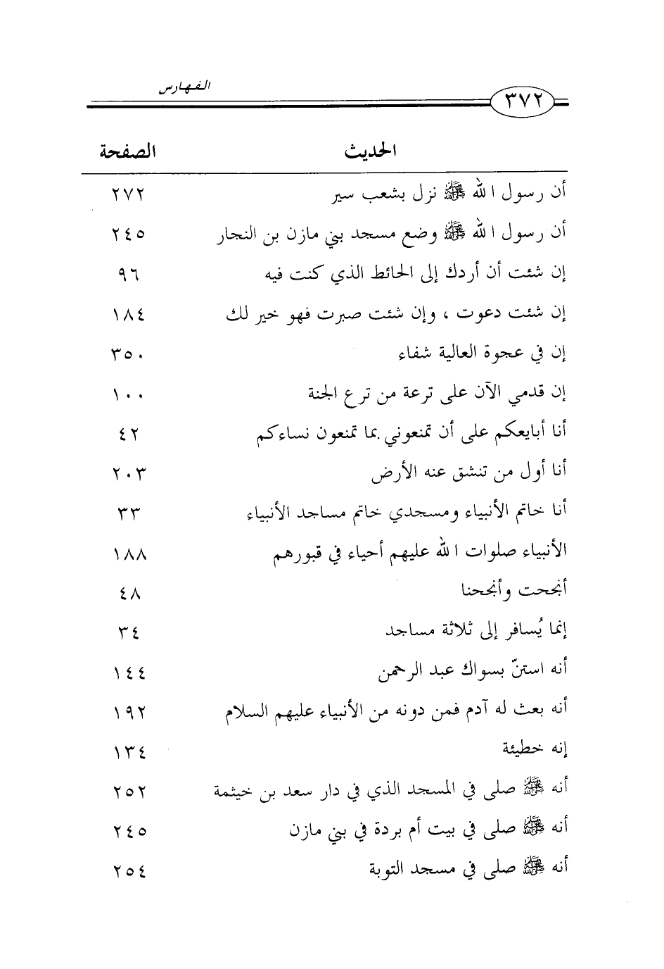 أن رسول الله صلى الله عليه وسلم نزل بشعب سير 272 أن رسول الله صلى الله عليه وسلم وضع مسجد بني مازن بن النجار 245 ان شئت أن أردك إلى الحائط الذي كنت فيه 96 ان شئت دعوت، وان شئت صبرت فهو خير لك 184 ان في عجوة العالية شفاء 350 ان قدمي الآن على ترعة من ترع الجنة 100 أنا أبايعكم على أن تمنعوني بما تمنعون نساءكم 42 أنا أول من تنشق عنه الأرض 203 أنا خاتم الأنبياء ومسجدي خاتم مساجد الأنبياء 33 الأنبياء صلوات الله عليهم أحياء في قبورهم 188 أنجحت وأنجحنا 48 انما يسافر إلى ثلاثة مساجد 34 أنه استن بسواك عبد الرحمن 144 أنه بعث له آدم فمن دونه من الأنبياء عليهم السلام 192 انه خطيئة 134 أنه صلى الله عليه وسلم صلى في المسجد الذي في دار سعد بن خيثمة 252 أنه صلى الله عليه وسلم صلى في بيت أم بردة في بني مازن 245 أنه صلى الله عليه وسلم صلى في مسجد التوبة 254…