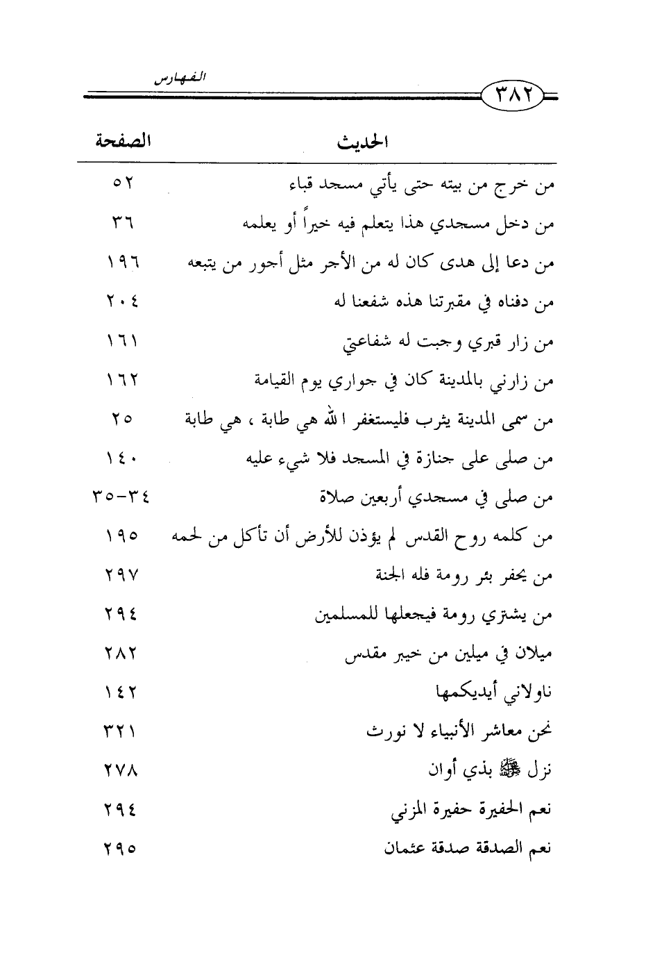 من خرج من بيته حتى يأتي مسجد قباء 52 من دخل مسجدي هذا يتعلم فيه خيراً أو يعلمه 36 من دعا إلى هدى كان له من الأجر مثل أجور من يتبعه 196 من دفناه في مقبرتنا هذه شفعنا له 204 من زار قبري وجبت له شفاعتي 161 من زارني بالمدينة كان في جواري يوم القيامة 162 من سمى المدينة يثرب فليستغفر الله هي طابة، هي طابة 25 من صلى على جنازة في المسجد فلا شيء عليه 140 من صلى في مسجدي أربعين صلاة 34 - 35 من كلمه روح القدس لم يؤذن للأرض أن تأكل من لحمه 195 من يحفر بئر رومة فله الجنة 297 من يشتري رومة فيجعلها للمسلمين 294 ميلان في ميلين من خيبر مقدس 282 ناولاني أيديكمها 142 نحن معاشر الأنبياء لا نورث 321 نزل صلى الله عليه وسلم بذي أوان 278 نعم الحفيرة حفيرة المزني 294 نعم الصدقة صدقة عثمان 295…