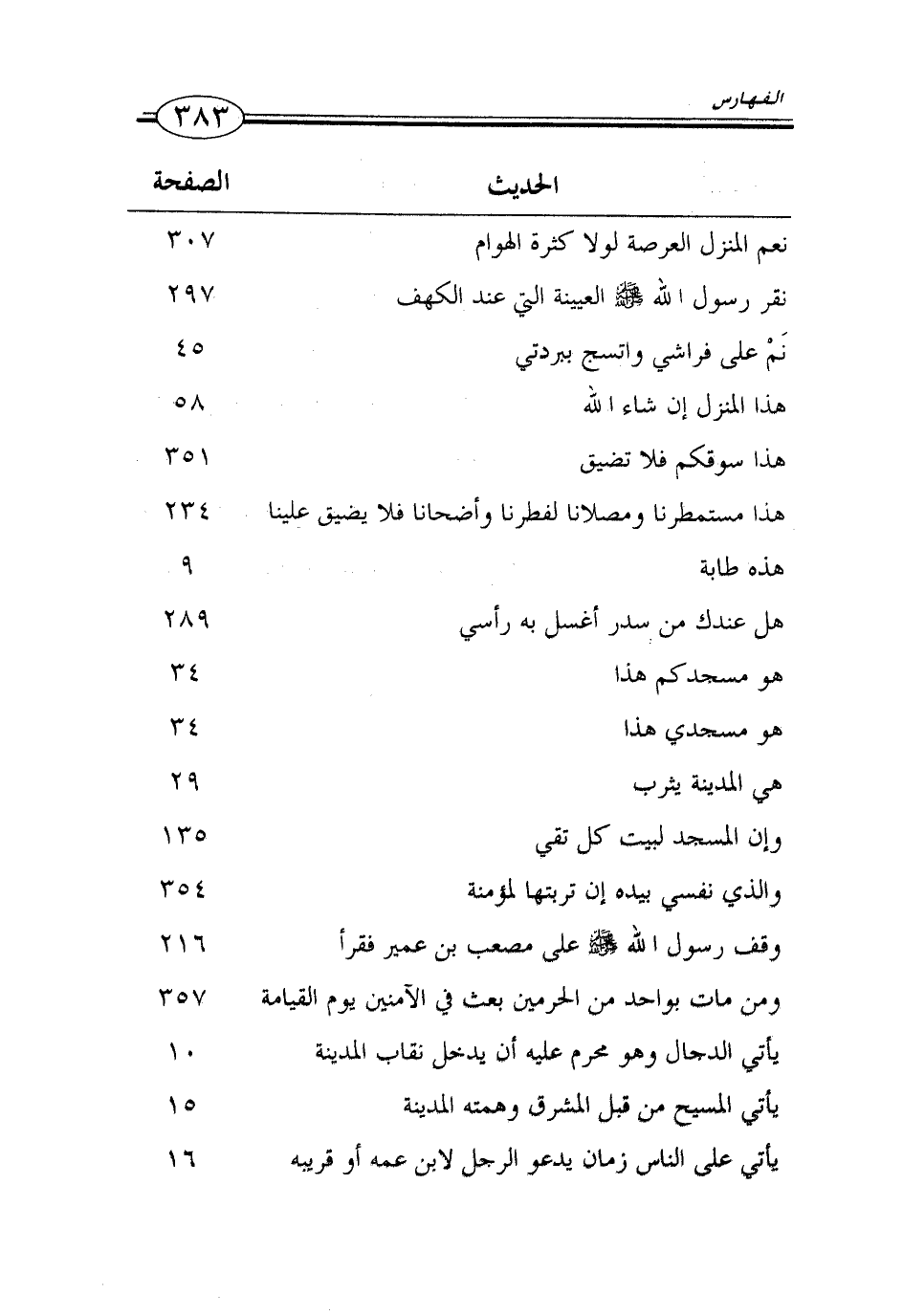 نعم المنزل العرصة لولا كثرة الهوام 307 نقر رسول الله صلى الله عليه وسلم العيينة التي عند الكهف 297 نم على فراشي واتسج ببردتي 45 هذا المنزل ان شاء الله 58 هذا سوقكم فلا تضيق 351 هذا مستمطرنا ومصلانا لفطرنا وأضحانا فلا يضيق علينا 234 هذه طابة 9 هل عندك من سدر أغسل به رأسي 289 هو مسجدكم هذا 34 هو مسجدي هذا 34 هي المدينة يثرب 29 وان المسجد لبيت كل تقي 135 والذي نفسي بيده ان تربتها لمؤمنة 354 وقف رسول الله صلى الله عليه وسلم على مصعب بن عمير فقرأ 216 ومن مات بواحد من الحرمين بعث في الآمنين يوم القيامة 357 يأتي الدجال وهو محرم عليه أن يدخل نقاب المدينة 10 يأتي المسيح من قبل المشرق وهمته المدينة 15 يأتي على الناس زمان يدعو الرجل لابن عمه أوقريبه 16…
