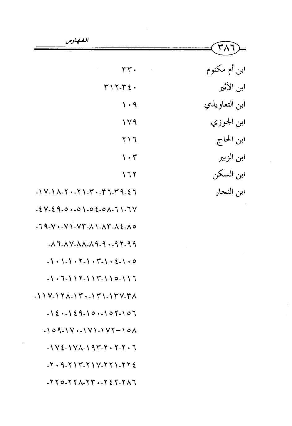 ابن أم مكتوم 330 ابن الأثير 340 - 312 ابن التعاويذي 109 ابن الجوزي 179 ابن الحاج 216 ابن الزبير 103 ابن السكن 162 ابن النجار 46 - 39 - 36 - 30 - 21 - 20 - 18 - 17 - 67 - 61 - 58 - 54 - 51 - 50 - 49 - 47 - 85 - 84 - 83 - 81 - 73 - 71 - 71 - 69 - 99 - 92 - 90 - 89 - 88 - 87 - 86 - 105 - 104 - 103 - 102 - 101 - 116 - 115 - 113 - 112 - 106 - 38 - 137 - 131 - 130 - 128 - 117 - 156 - 152 - 150 - 149 - 140 - 158 - 172 - 171 - 170 - 159 - 206 - 202 - 193 - 178 - 174 - 224 - 221 - 217 - 213 - 209 - 286 - 242 - 230 - 228 - 225 - …