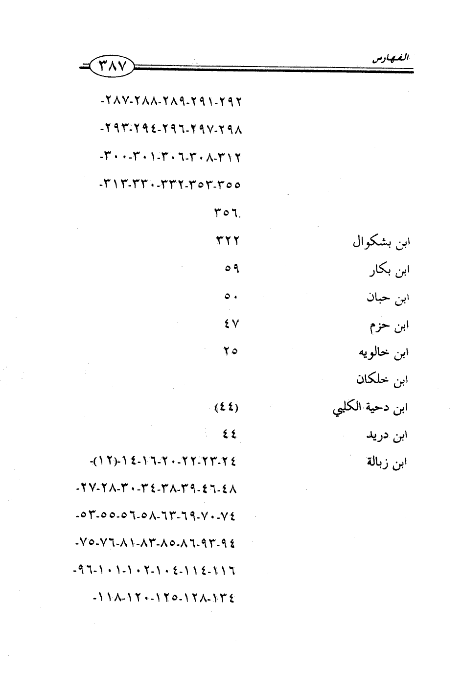 292 - -291 - 289 - 288 - 287 - 298 - 297 - 296 - 294 - 293 - 312 - 308 - 306 - 301 - 300 - 355 - 353 - 332 - 330 - 313 - 356 ابن بشكوال 322 ابن بكار 59 ابن حبان 50 ابن حزم 47 ابن خالويه 25 ابن خلكان ابن دحية الكلبي (44) ابن دريد 44 ابن زبالة 24 - 23 - 20 - 16 - 14 - (12) - 48 - 46 - 39 - 38 - 34 - 30 - 28 - 27 - 74 - 70 - 69 - 63 - 58 - 56 - 55 - 53 - 94 - 93 - 86 - 85 - 83 - 81 - 76 - 75 - 116 - 114 - 104 - 102 - 101 - 96 - 134 - 128 - 125 - 120 - 118 - …