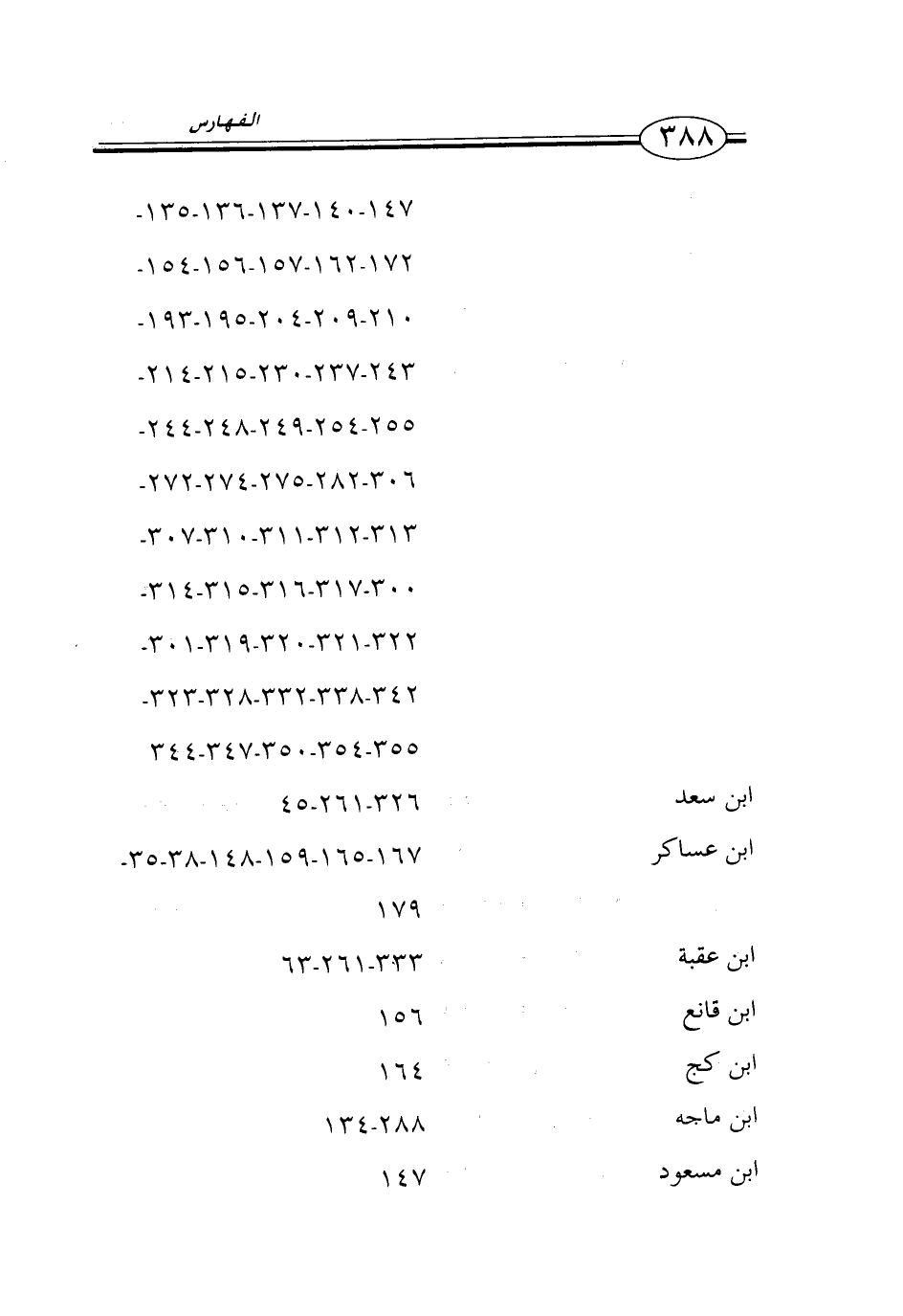 147 - 140 - 137 - 136 - 135 - 172 - 162 - 157 - 156 - 154 - 210 - 209 - 204 - 195 - 193 - 243 - 237 - 230 - 215 - 214 - 255 - 254 - 249 - 248 - 244 - 306 - 282 - 275 - 274 - 272 - 313 - 312 - 311 - 310 - 307 - 300 - 317 - 316 - 315 - 314 - 322 - 321 - 320 - 319 - 301 - 342 - 338 - 332 - 328 - 323 - 355 - 354 - 350 - 347 - 344 ابن سعد 326 - 261 - 45 ابن عساكر 167 - 165 - 159 - 148 - 38 - 35 - 179 ابن عقبة 333 - 261 - 63 ابن قانع 156 ابن كج 164 ابن ماجه 288 - 134 ابن مسعود 147…