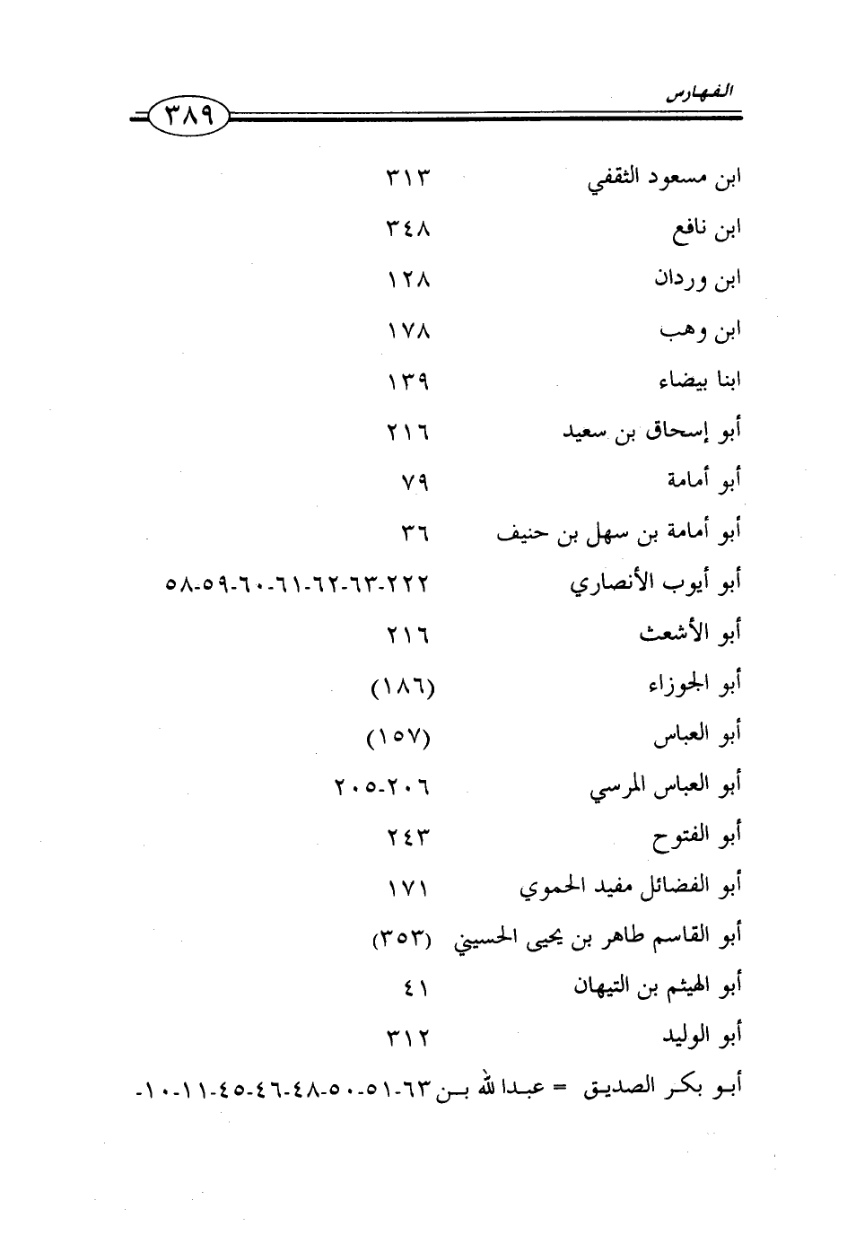 ابن مسعود الثقفي 313 ابن نافع 348 ابن وردان 128 ابن وهب 178 ابنا بيضاء 139 أبو اسحاق بن سعيد 216 أبو أمامة 79 أبو أمامة بن سهل بن حنيف 36 أبو أيوب الأنصاري 222 - 63 - 62 - 61 - 60 - 59 - 58 أبو الأشعث 216 أبو الجوزاء (186) أبو العباس (157) أبو العباس المرسي 206 - 205 أبو الفتوح 243 أبو الفضائل مفيد الحموي 171 أبو القاسم طاهر بن يحيى الحسيني (353) أبو الهيثم بن التيهان 41 أبو الوليد 312 أبو بكر الصديق = عبد الله بن 63 - 51 - 50 - 48 - 46 - 45 - 11 - 10 - …