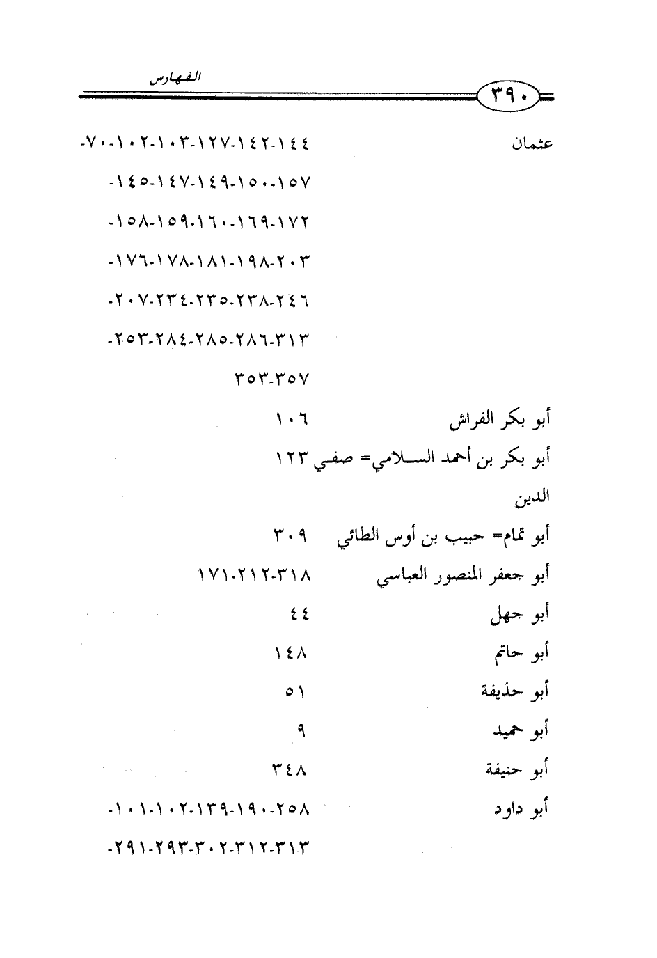 عثمان 144 - 142 - 127 - 103 - 102 - 70 - 157 - 150 - 149 - 147 - 145 - 172 - 169 - 160 - 159 - 158 - 203 - 198 - 181 - 178 - 176 - 246 - 238 - 235 - 234 - 207 - 313 - 286 - 285 - 284 - 253 - 357 - 353 أبو بكر الفراش 106 أبو بكر بن أحمد السلامي = صفي 123 الدين أبو تمام = حبيب بن أوس الطائي 309 أبو جعفر المنصور العباسي 318 - 212 - 171 أبو جهل 44 أبو حاتم 148 أبو حذيفة 51 أبو حميد 9 أبو حنيفة 348 أبو داود 258 - 190 - 139 - 102 - 101 - 313 - 312 - 302 - 293 - 291 - …