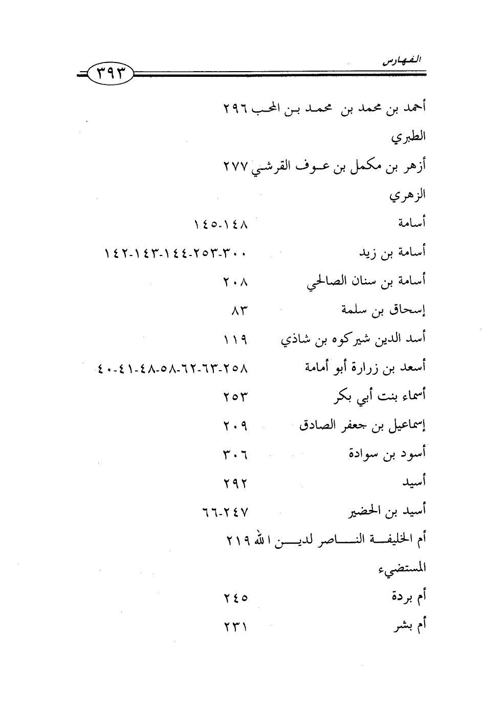 أحمد بن محمد بن محمد بن المحب 296 الطبري أزهر بن مكمل بن عوف القرشي 277 الزهري أسامة 148 - 145 أسامة بن زيد 300 - 253 - 144 - 143 - 142 أسامة بن سنان الصالحي 208 اسحاق بن سلمة 83 أسد الدين شيركوه بن شاذي 119 أسعد بن زرارة أبو أمامة 258 - 63 - 62 - 58 - 48 - 41 - 40 أسماء بنت أبي بكر 253 اسماعيل بن جعفر الصادق 209 أسود بن سوادة 306 أسيد بن الحضير 247 - 66 أم الخليفة الناصر لدين الله 219 المستضيء أم بردة 245 أم بشر 231…