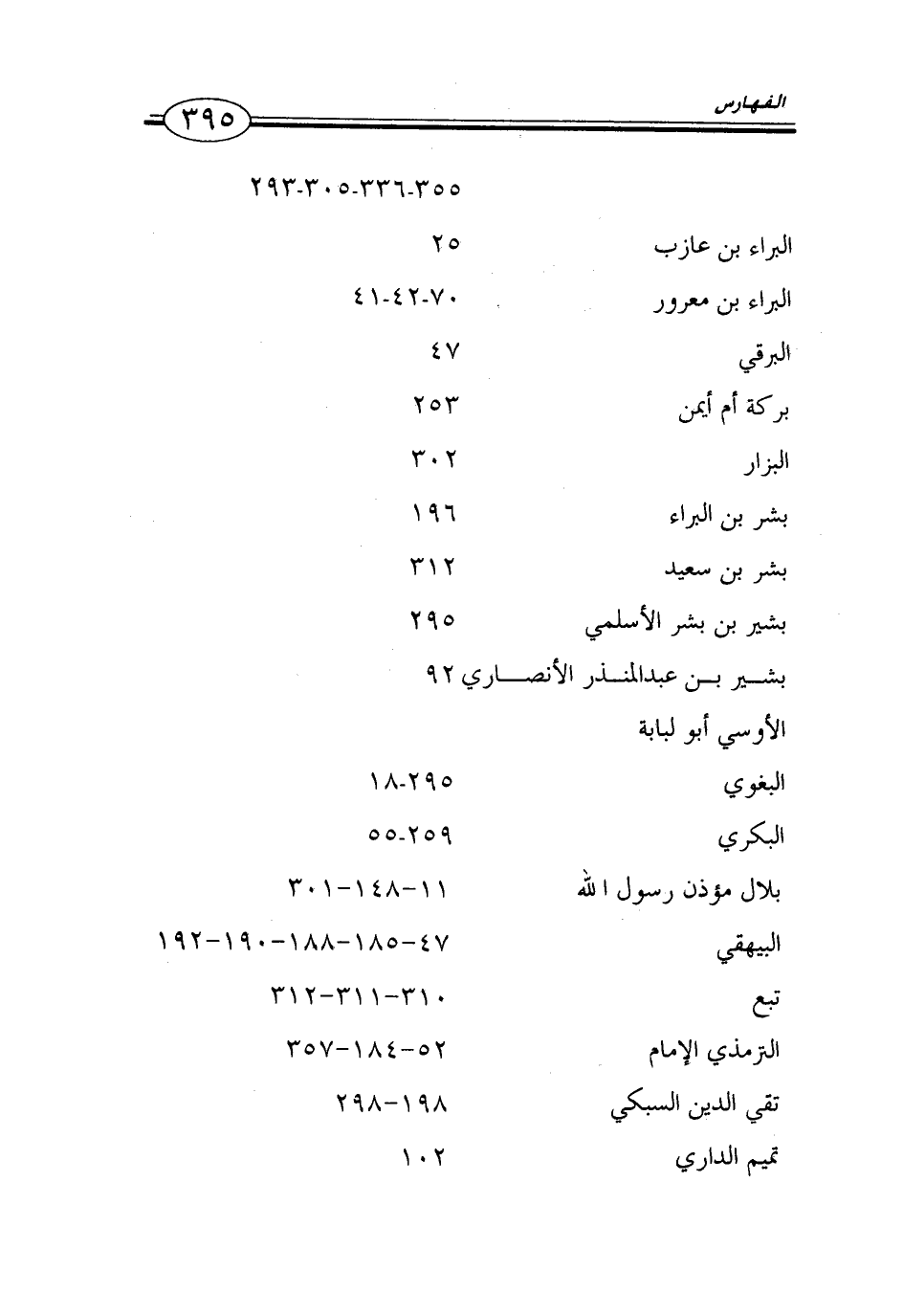 355 - 336 - 305 - 293 البراء بن عازب 25 البراء بن معرور 70 - 42 - 41 البرقي 47 بركة أم أيمن 253 البزار 302 بشر بن البراء 196 بشر بن سعيد 312 بشير بن بشر الأسلمي 295 بشير بن عبد المنذر الأنصاري 92 الأوسي أبو لبابة البغوي 295 - 18 البكري 259 - 55 بلال مؤذن رسول الله 11 - 148 - 301 البيهقي 47 - 185 - 188 - 190 - 192 تبع 310 - 311 - 312 الترمذي الإمام 52 - 184 - 357 تقي الدين السبكي 198 - 298 تميم الداري 102…