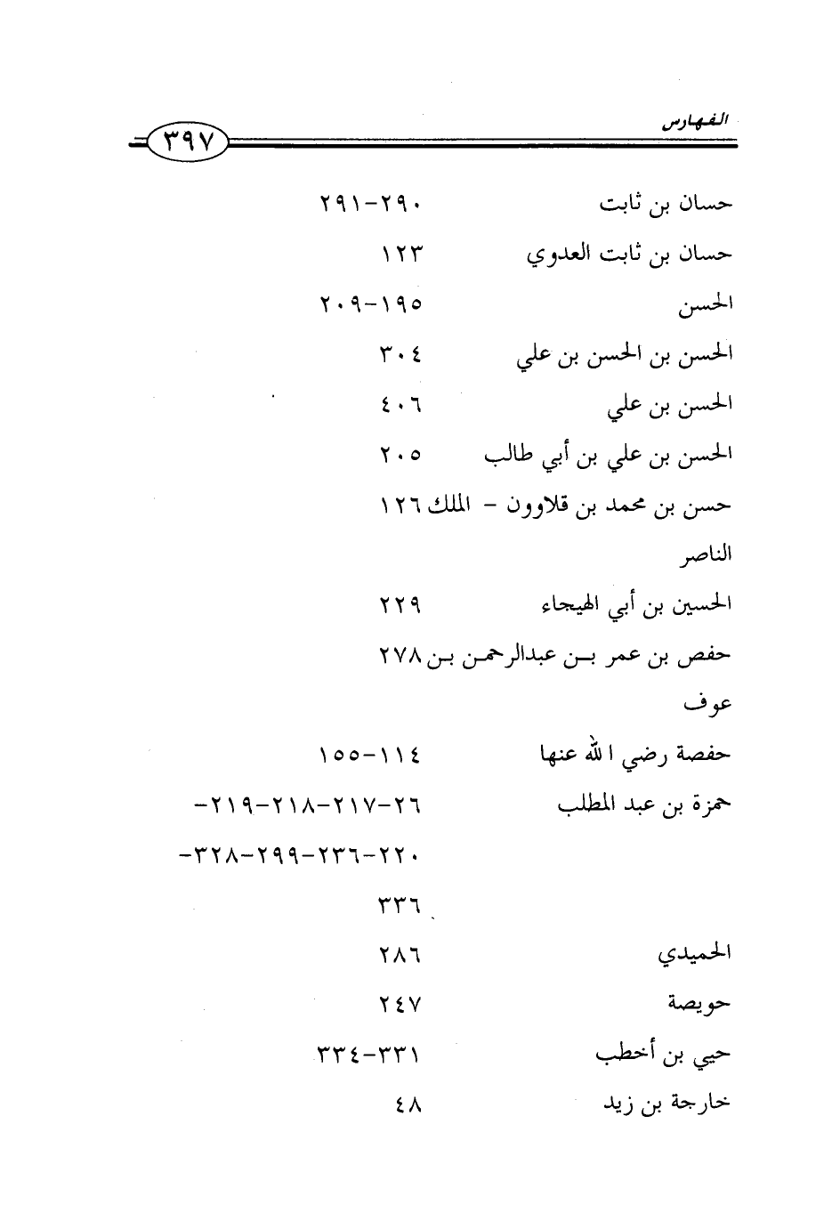 حسان بن ثابت 290 - 291 حسان بن ثابت العدوي 123 الحسن 195 - 209 الحسن بن الحسن بن علي 304 الحسن بن علي 406 الحسن بن علي بن أبي طالب 205 حسن بن محمد بن قلاوون - الملك 126 الناصر الحسين بن أبي الهيجاء 229 حفص بن عمر بن عبد الرحمن بن 278 عوف حفصة رضي الله عنها 114 - 155 حمزة بن عبد المطلب 26 - 217 - 218 - 219 - 220 - 236 - 299 - 328 - 336 الحميدي 286 حويصة 247 حيي بن أخطب 331 - 334 خارجة بن زيد 48…