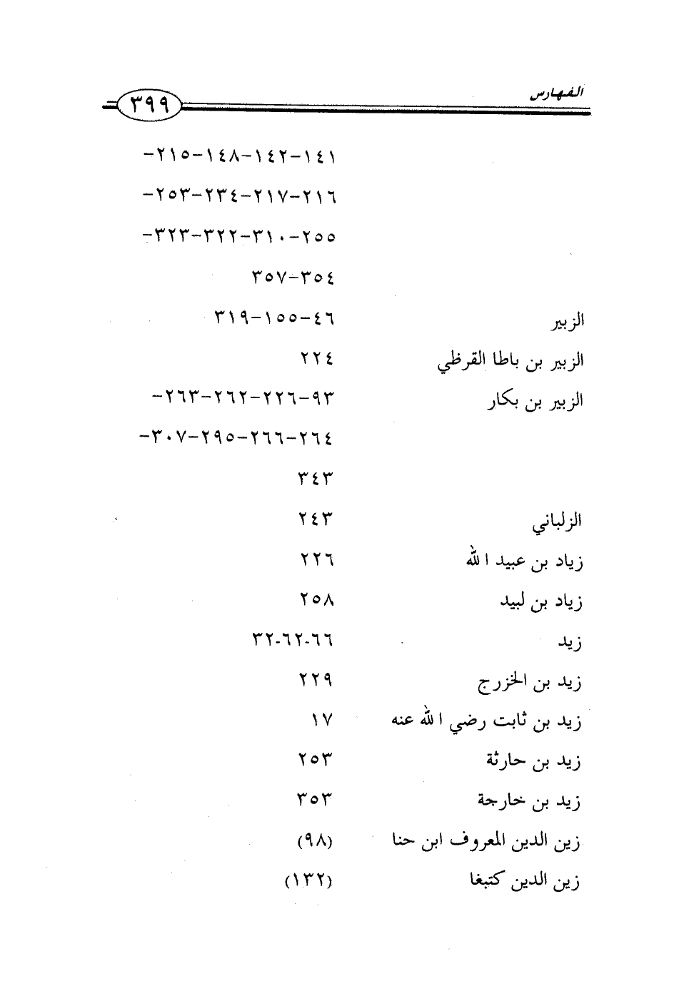 141 - 142 - 148 - 215 - 216 - 217 - 234 - 253 - 255 - 310 - 322 - 323 - 354 - 357 الزبير 46 - 155 - 319 الزبير بن باطا القرظي 224 الزبير بن بكار 93 - 226 - 262 - 263 - 264 - 266 - 295 - 307 - 343 الزلباني 243 زياد بن عبيد الله 226 زياد بن لبيد 258 زيد 66 - 62 - 32 زيد بن الخزرج 229 زيد بن ثابت رضي الله عنه 17 زيد بن حارثة 253 زيد بن خارجة 353 زين الدين المعروف ابن حنا (98) زين الدين كتبغا (132) …