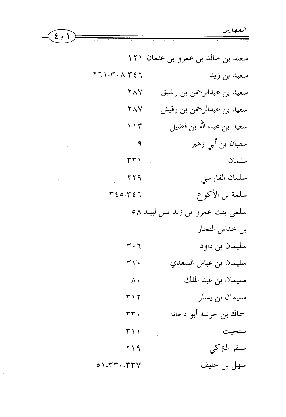 سعيد بن خالد بن عمرو بن عثمان 121 سعيد بن زيد 346 - 308 - 261 سعيد بن عبد الرحمن بن رشيق 287 سعيد بن عبد الرحمن بن رقيش 287 سعيد بن عبد الله بن فضيل 113 سفيان بن أبي زهير 9 سلمان 331 سلمان الفارسي 229 سلمة بن الأكوع 346 - 345 سلمى بنت عمرو بن زيد بن لبيد 58 بن خداس سليمان بن داود 306 سليمان بن عباس السعدي 310 سليمان بن عبد الملك 80 سليمان بن يسار 312 سماك بن خرشة أبو دجانة 330 سنحيت 311 سنقر التركي 219 سهل بن حنيف 337 - 330 - 51…
