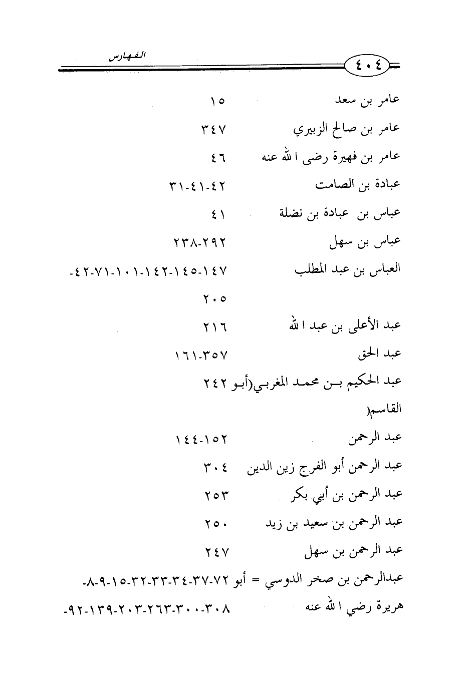 عامر بن سعد 15 عامر بن صالح الزبيري 347 عامر بن فهيرة رضي الله عنه 46 عبادة بن الصامت 42 - 41 - 31 عباس بن عبادة بن نضلة 41 عباس بن سهل 292 - 238 العباس بن عبد المطلب 147 - 145 - 142 - 101 - 71 - 42 - 205 عبد الأعلى بن عبد الله 216 عبد الحق 357 - 161 عبد الحكيم بن محمد المغربي (أبو 242 القاسم عبد الرحمن 152 - 144 عبد الرحمن أبو الفرج زين الدين 304 عبد الرحمن بن أبي بكر 253 عبد الرحمن بن سعيد بن زيد 250 عبد الرحمن بن سهل 247 عبد الرحمن بن صخر الدوسي = أبو 72 - 37 - 34 - 33 - 32 - 15 - 9 - 8 - هريرة رضي الله عنه 308 - 300 - 263 - 203 - 139 - 92 - …