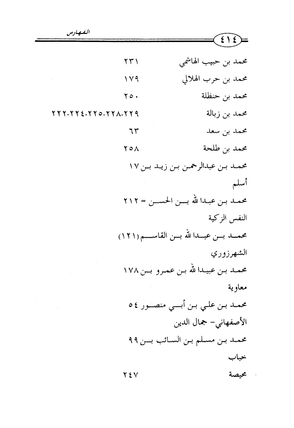 محمد بن حبيب الهاشمي 231 محمد بن حرب الهلالي 179 محمد بن حنظلة 250 محمد بن زبالة 229 - 228 - 225 - 224 - 222 محمد بن سعد 63 محمد بن طلحة 258 محمد بن عبد الرحمن بن زيد بن 17 أسلم محمد بن عبد الله بن الحسن = 212 النفس الزكية محمد بن عبد الله بن القاسم (121) الشهرزوري محمد بن عبيد الله بن عمرو بن 178 معاوية محمد بن علي بن أبي منصور 54 الأصفهاني - جمال الدين محمد بن مسلم بن السائب بن 99 خباب محيصة 247…