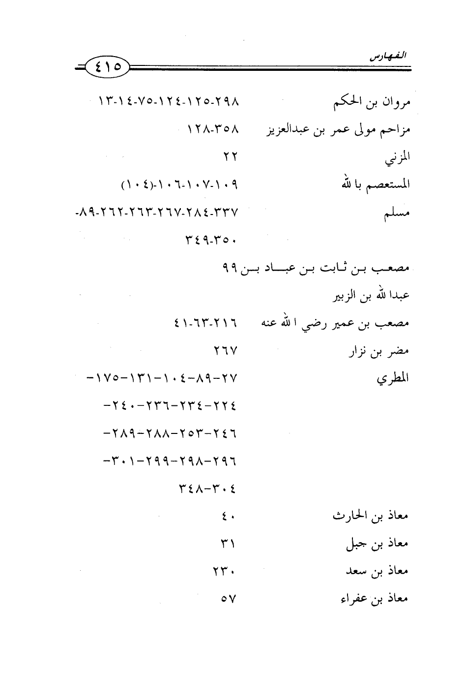 مروان بن الحكم 298 - 125 - 124 - 75 - 14 - 13 مزاحم مولى عمر بن عبد العزيز 358 - 128 المزني 22 المستعصم بالله 109 - 107 - 106 - (104) مسلم 337 - 284 - 267 - 263 - 262 - 89 350 - 349 مصعب بن ثابت بن عباد بن 99 عبد الله بن الزبير مصعب بن عمير رضي الله عنه 216 - 63 - 41 مضر بن نزار 267 المطري 27 - 89 - 104 - 131 - 175 224 - 234 - 236 - 240 246 - 253 - 288 - 289 296 - 298 - 299 - 301 304 - 348 معاذ بن الحارث 40 معاذ بن جبل 31 معاذ بن سعد 230 معاذ بن عفراء 57…