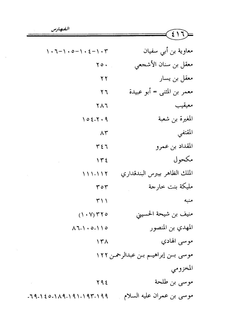 معاوية بن أبي سفيان 103 - 104 - 105 - 106 معقل بن سنان الأشجعي 250 معقل بن يسار 22 معمر بن المثنى = أبو عبيدة 26 معيقيب 286 المغيرة بن شعبة 209 - 154 المقتفي 83 المقداد بن عمرو 346 مكحول 134 الملك الظاهر بيبرس البندقداري 112 - 111 مليكة بنت خارجة 353 منبه 311 منيف بن شيحة الحسيني 325 (107) المهدي بن المنصور 115 - 105 - 86 موسى الهادي 138 موسى بن ابراهيم بن عبد الرحمن 122 المخزومي موسى بن طلحة 294 موسى بن عمران عليه السلام 199 - 193 - 191 - 189 - 145 - 69…