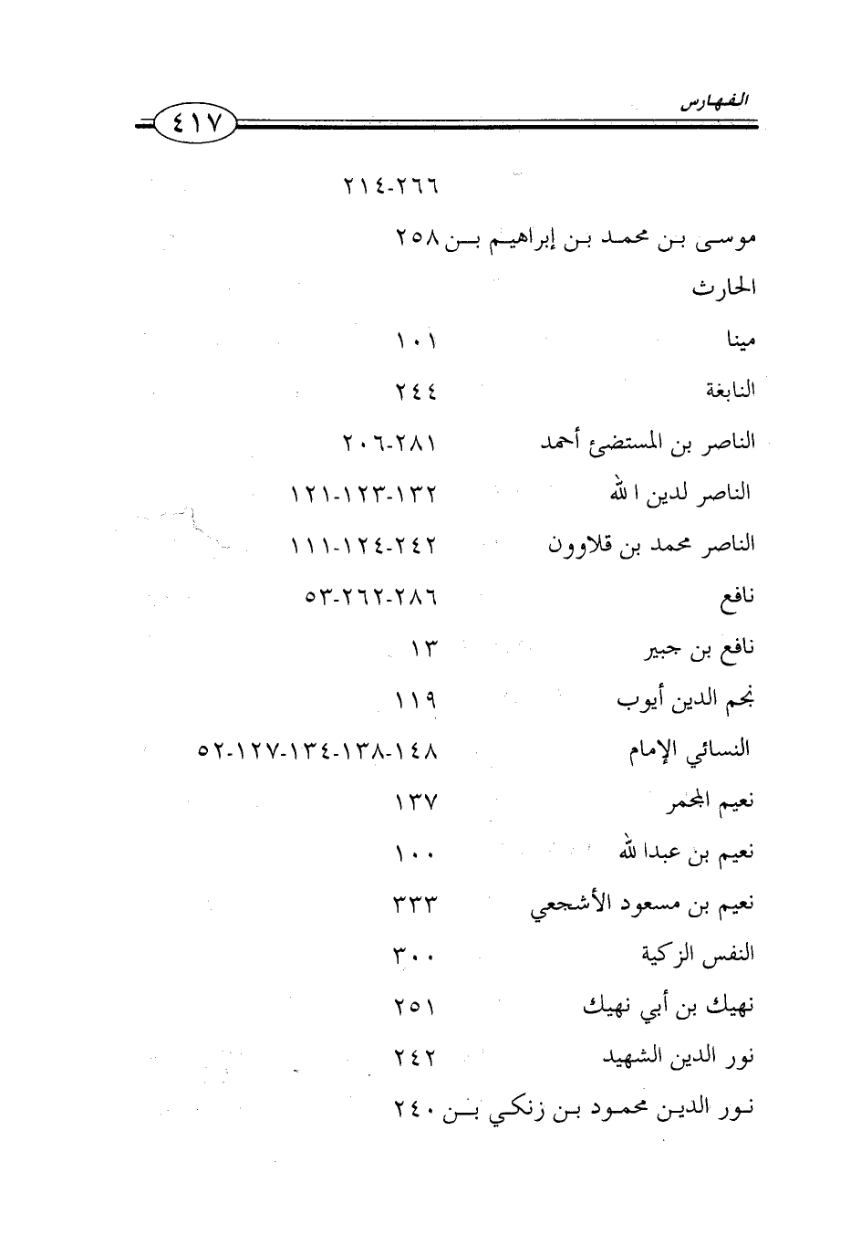 266 - 214 موسى بن محمد بن ابراهيم بن 258 الحارث مينا 101 النابغة 244 الناصر بن المستضئ أحمد 281 - 206 الناصر لدين الله 132 - 123 - 121 الناصر محمد بن قلاوون 242 - 124 - 111 نافع 286 - 262 - 53 نافع بن جبير 13 نجم الدين أيوب 119 النسائي الإمام 148 - 138 - 134 - 127 - 52 نعيم المجمر 137 نعيم بن عبد الله 100 نعيم بن مسعود الأشجعي 333 النفس الزكية 300 نهيك بن أبي نهيك 251 نور الدين الشهيد 242 نور الدين محمود بن زنكي بن 240…