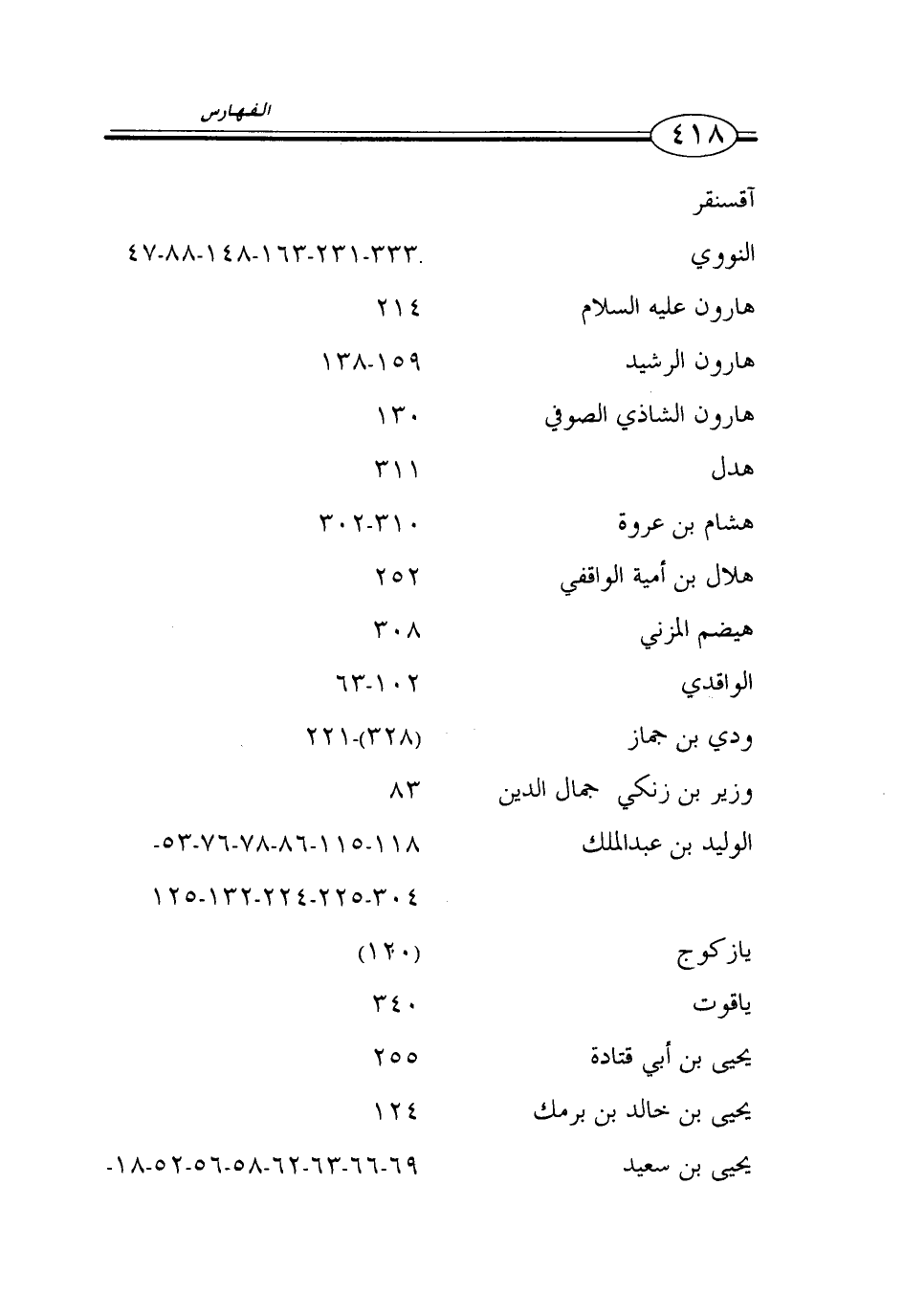 آقسنقر النووي 333 - 231 - 163 - 148 - 88 - 47 هارون عليه السلام 214 هارون الرشيد 159 - 138 هارون الشاذي الصوفي 130 هدل 311 هشام بن عروة 310 - 302 هلال بن أمية الواقفي 252 هيضم المزني 308 الواقدي 102 - 63 ودي بن جماز (328) - 221 وزير بن زنكي جمال الدين 83 الوليد بن عبد الملك 118 - 115 - 86 - 78 - 76 - 53 304 - 225 - 224 - 132 - 125 يازكوج (120) ياقوت 340 يحيى بن أبي قتادة 255 يحيى بن خالد بن برمك 124 يحيى بن سعيد 69 - 66 - 63 - 62 - 58 - 56 - 52 - 18…