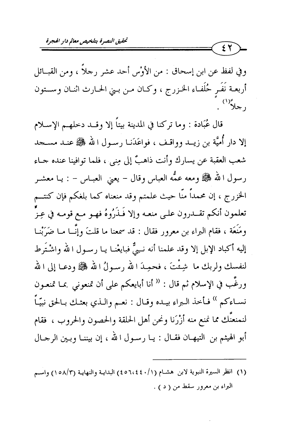 (1) انظر السيرة النبوية لابن هشام (1/ 440، 456) البداية والنهاية (3/ 158) واسم البراء بن معرور سقط من (د).