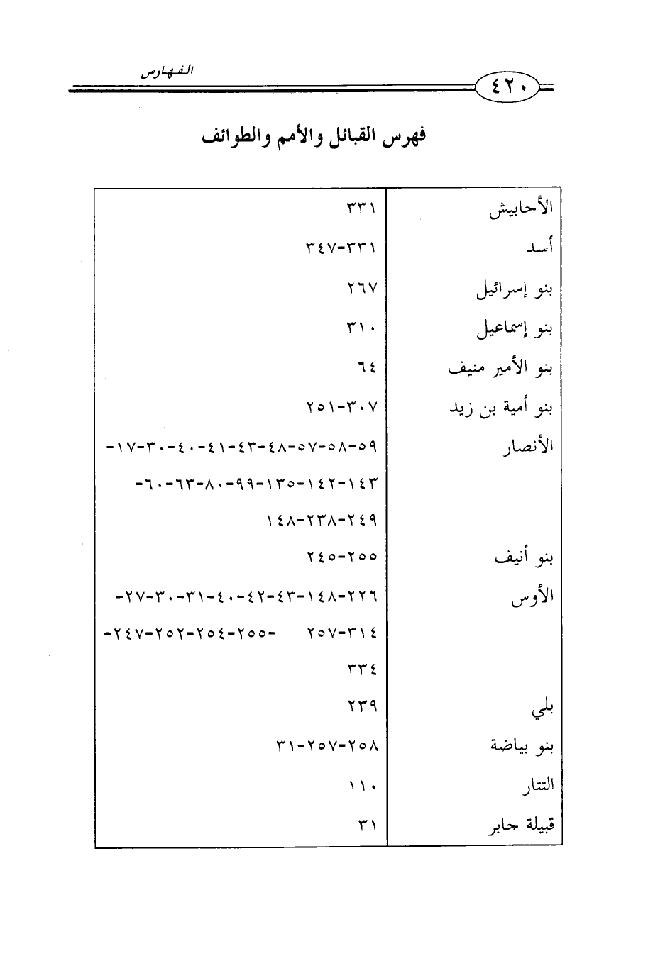 الأحابيش 331 أسد 331 - 347 بنو اسرائيل 267 بنو اسماعيل 310 بنو الأمير منيف 64 بنو أمية بن زيد 307 - 251 الأنصار 59 - 58 - 57 - 48 - 43 - 41 - 40 - 30 - 17 143 - 142 - 135 - 99 - 80 - 63 - 60 249 - 238 - 148 بنو أنيف 255 - 245 الأوس 226 - 148 - 43 - 42 - 40 - 31 - 30 - 27 314 - 257 - 255 - 254 - 252 - 247 - 334 بلي 239 بنو بياضة 258 - 257 - 31 التتار 110 قبيلة جابر 31…