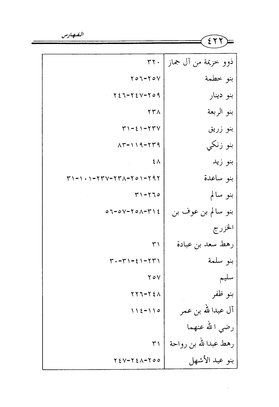 ذوو خزيمة من آل جماز 320 بنو خطمة 257 - 256 بنو دينار 259 - 247 - 246 بنو الربعة 238 بنو زريق 237 - 41 - 31 بنو زنكي 239 - 119 - 83 بنو زيد 48 بنو ساعدة 292 - 251 - 238 - 237 - 101 - 31 بنو سالم 265 - 31 بنو سالم بن عوف بن 314 - 258 - 57 - 56 الخزرج رهط سعد بن عبادة 31 بنو سلمة 231 - 41 - 31 - 30 سليم 257 بنو ظفر 248 - 226 آل عبد الله بن عمر 115 - 114 رضي الله عنهما رهط عبد الله بن رواحة 31 بنو عبد الأشهل 255 - 248 - 247…